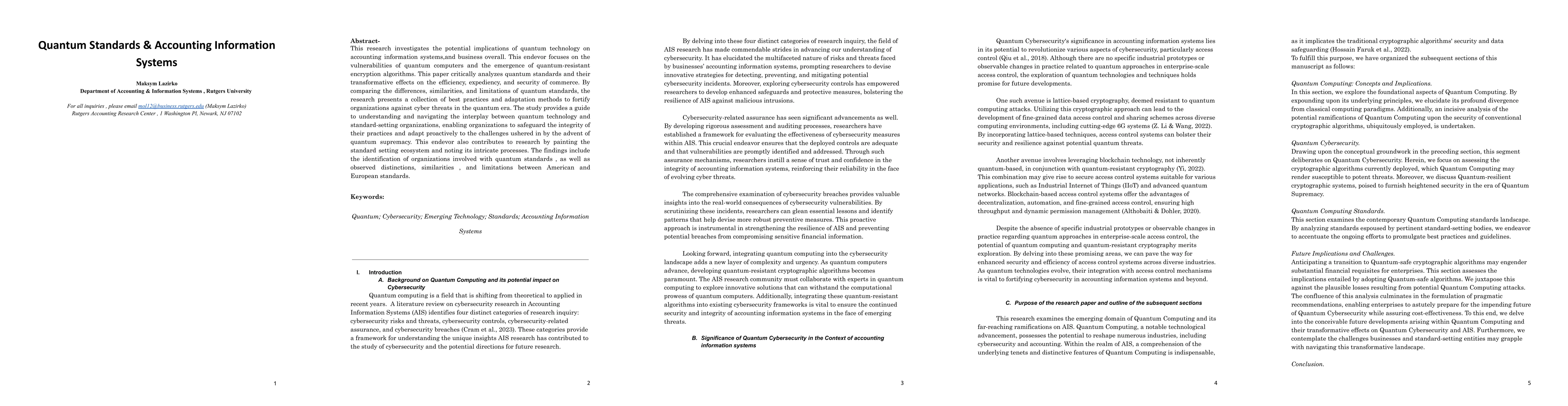 This research investigates the potential implications of quantum technology on accounting information systems, and business overall. This endeavor focuses on the vulnerabilities of quantum computers and the emergence of quantum-resistant encryption algorithms. This paper critically analyzes quantum standards and their transformative effects on the efficiency, expediency, and security of commerce. By comparing the differences, similarities, and limitations of quantum standards, the research presents a collection of best practices and adaptation methods to fortify organizations against cyber threats in the quantum era. The study provides a guide to understanding and navigating the interplay between quantum technology and standard-setting organizations, enabling organizations to safeguard the integrity of their practices and adapt proactively to the challenges ushered in by the advent of quantum supremacy. This endeavor also contributes to research by painting the standard-setting ecosystem and noting its intricate processes. The findings include the identification of organizations involved with quantum standards, as well as observed distinctions, similarities, and limitations between American and European standards.