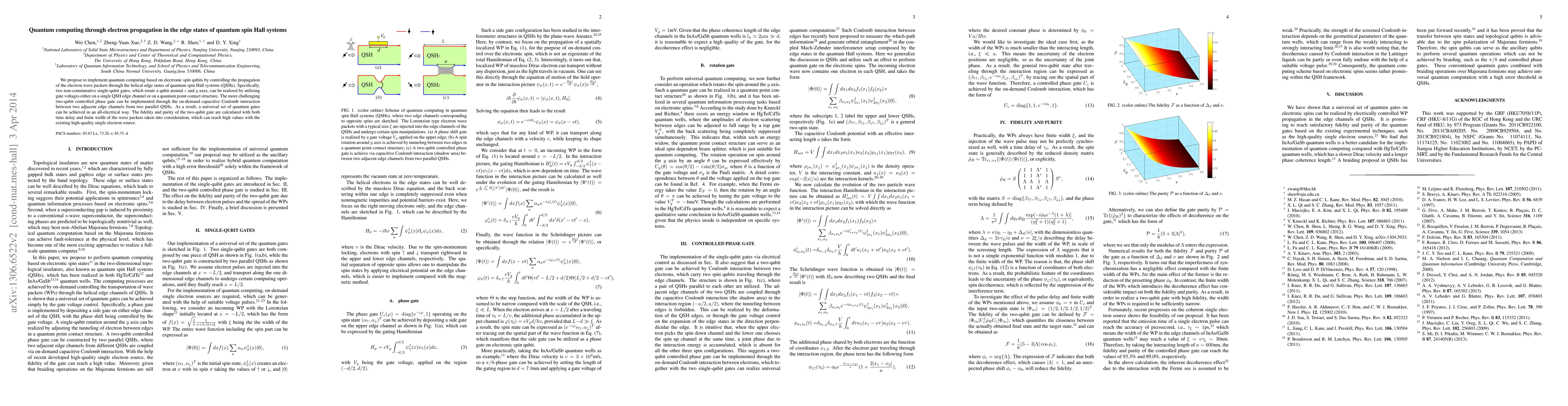 This paper proposes a quantum computing framework utilizing electron propagation in the edge states of quantum spin Hall systems (QSHs) to implement quantum gates. It demonstrates the feasibility of realizing single-qubit and two-qubit gates using gate voltages and capacitive Coulomb interactions, achieving a universal set of quantum gates in an all-electrical manner.