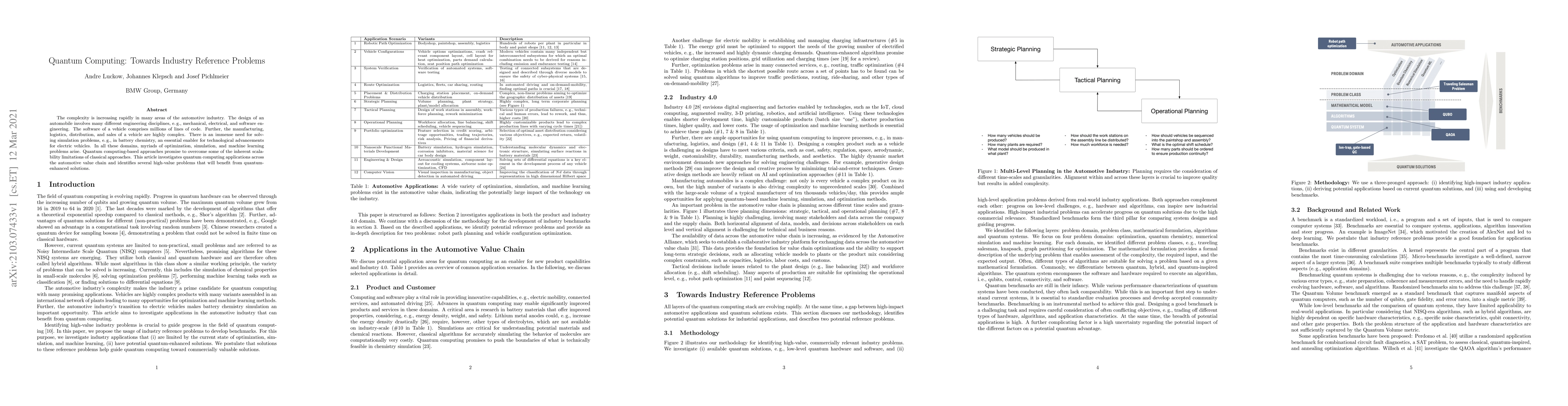 The complexity is increasing rapidly in many areas of the automotive industry. The design of an automobile involves many different engineering disciplines, e. g., mechanical, electrical, and software engineering. The software of a vehicle comprises millions of lines of code. Further, the manufacturing, logistics, distribution, and sales of a vehicle are highly complex. There is an immense need for solving simulation problems, e. g., in battery chemistry, an essential enabler for technological advancements for electric vehicles. In all these domains, myriads of optimization, simulation, and machine learning problems arise. Quantum computing-based approaches promise to overcome some of the inherent scalability limitations of classical approaches. This article investigates quantum computing applications across the automotive value chain and identifies several high-value problems that will benefit from quantum-enhanced solutions.