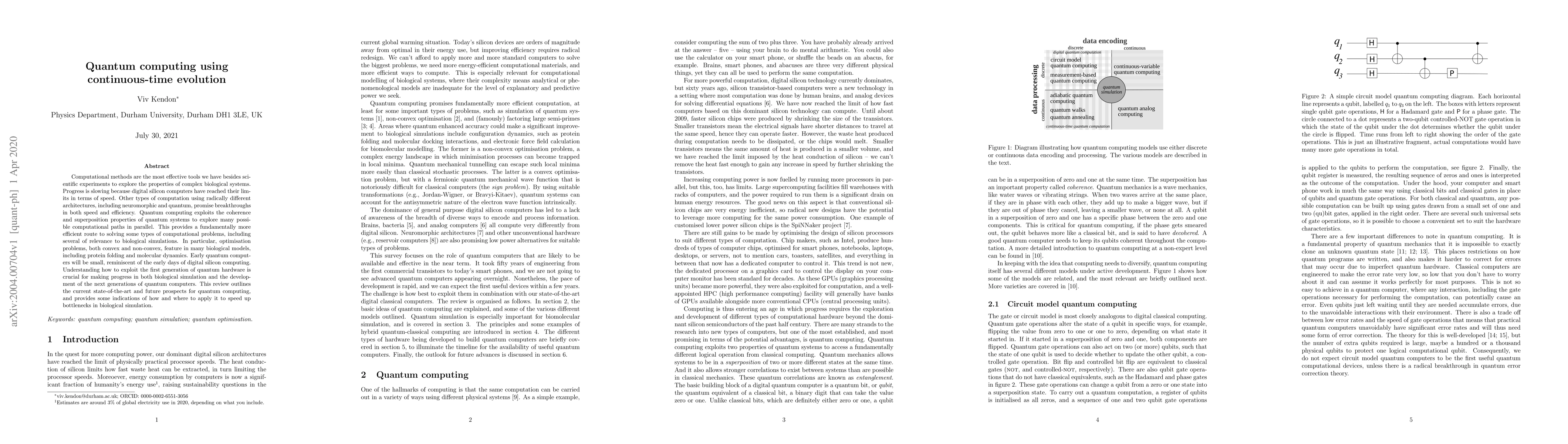 Computational methods are the most effective tools we have besides scientific experiments to explore the properties of complex biological systems. Progress is slowing because digital silicon computers have reached their limits in terms of speed. Other types of computation using radically different architectures, including neuromorphic and quantum, promise breakthroughs in both speed and efficiency. Quantum computing exploits the coherence and superposition properties of quantum systems to explore many possible computational paths in parallel. This provides a fundamentally more efficient route to solving some types of computational problems, including several of relevance to biological simulations. In particular, optimisation problems, both convex and non-convex, feature in many biological models, including protein folding and molecular dynamics. Early quantum computers will be small, reminiscent of the early days of digital silicon computing. Understanding how to exploit the first generation of quantum hardware is crucial for making progress in both biological simulation and the development of the next generations of quantum computers. This review outlines the current state-of-the-art and future prospects for quantum computing, and provides some indications of how and where to apply it to speed up bottlenecks in biological simulation.