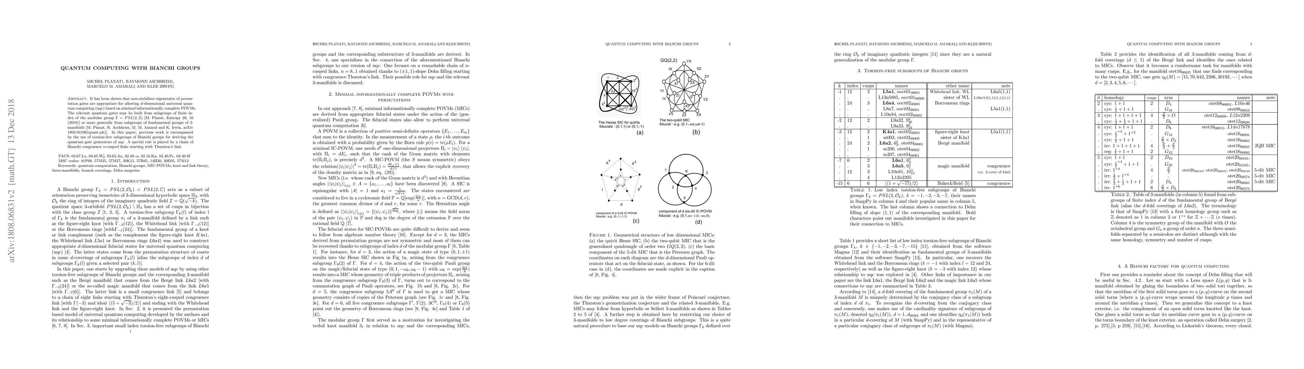 It has been shown that non-stabilizer eigenstates of permutation gates are appropriate for allowing $d$-dimensional universal quantum computing (uqc) based on minimal informationally complete POVMs. The relevant quantum gates may be built from subgroups of finite index of the modular group $\Gamma=PSL(2,\mathbb{Z})$ [M. Planat, Entropy 20, 16 (2018)] or more generally from subgroups of fundamental groups of $3$-manifolds [M. Planat, R. Aschheim, M.~M. Amaral and K. Irwin, arXiv 1802.04196(quant-ph)]. In this paper, previous work is encompassed by the use of torsion-free subgroups of Bianchi groups for deriving the quantum gate generators of uqc. A special role is played by a chain of Bianchi congruence $n$-cusped links starting with Thurston's link.