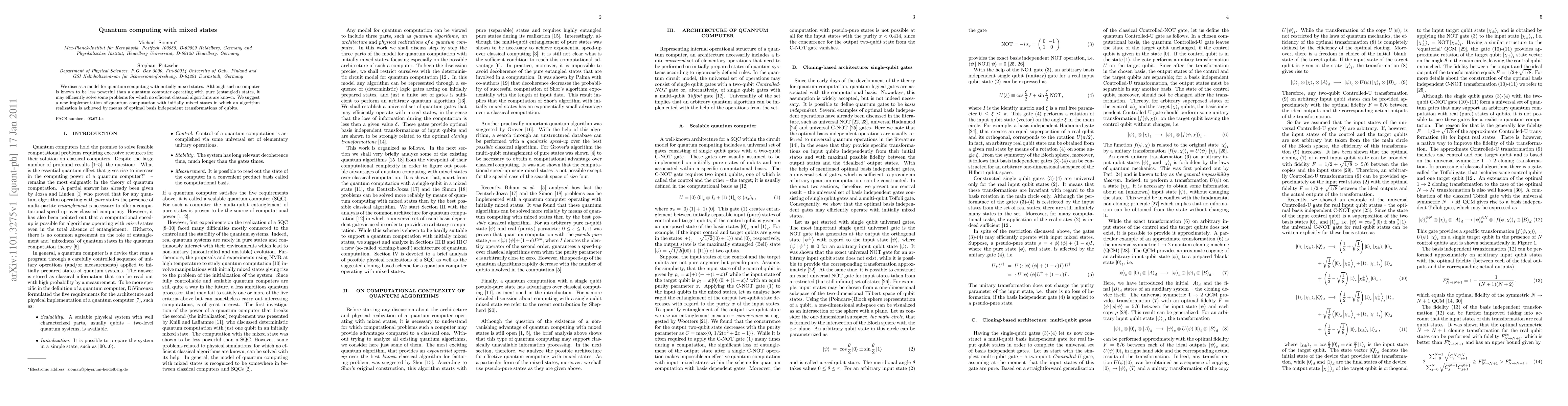 This paper proposes a model for quantum computing using initially mixed states, demonstrating its efficiency in solving certain problems without efficient classical algorithms. It introduces a new implementation based on optimal basis-independent transformations of qubits.
