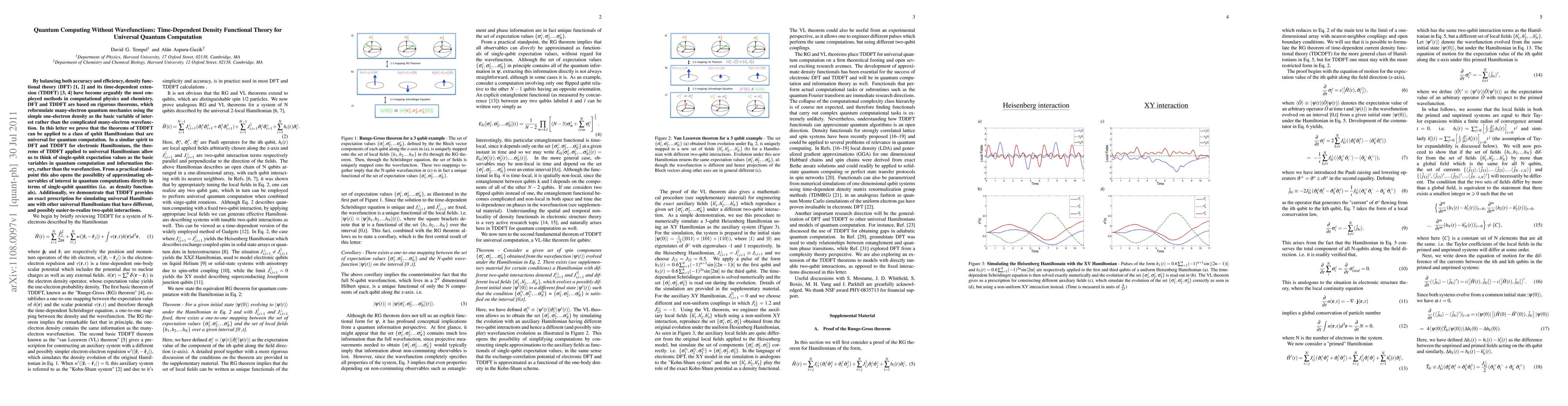 This paper demonstrates that Time-Dependent Density Functional Theory (TDDFT) can be applied to universal quantum computation, allowing for quantum computation using single-qubit expectation values instead of wavefunctions, and provides a method for simulating universal Hamiltonians using different, potentially easier two-qubit interactions.