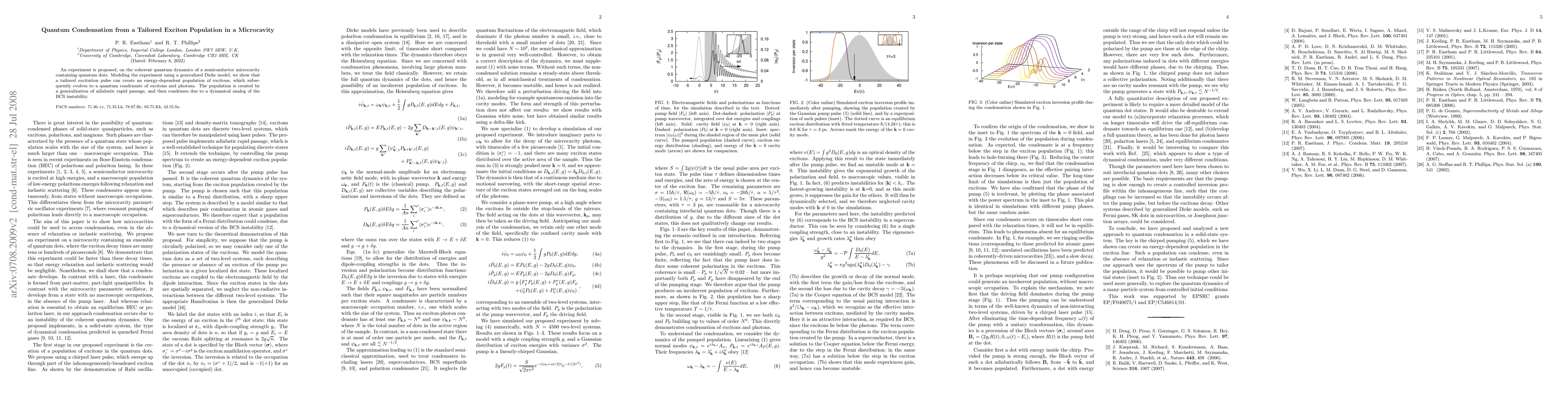 An experiment is proposed, on the coherent quantum dynamics of a semiconductor microcavity containing quantum dots. Modeling the experiment using a generalized Dicke model, we show that a tailored excitation pulse can create an energy-dependent population of excitons, which subsequently evolves to a quantum condensate of excitons and photons. The population is created by a generalization of adiabatic rapid passage, and then condenses due to a dynamical analog of the BCS instability.