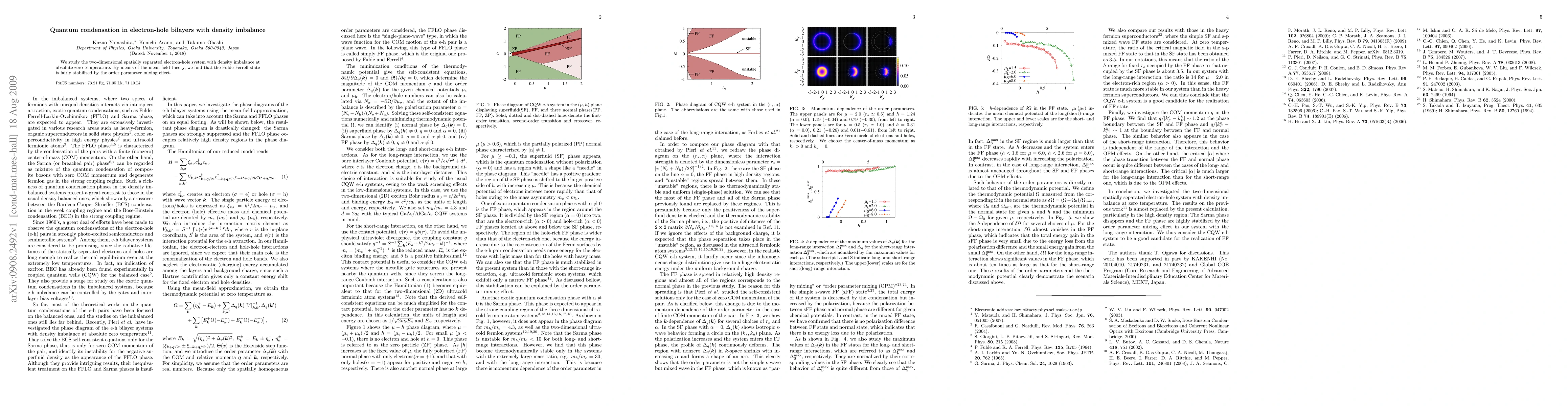We study the two-dimensional spatially separated electron-hole system with density imbalance at absolute zero temperature. By means of the mean-field theory, we find that the Fulde-Ferrell state is fairly stabilized by the order parameter mixing effect.