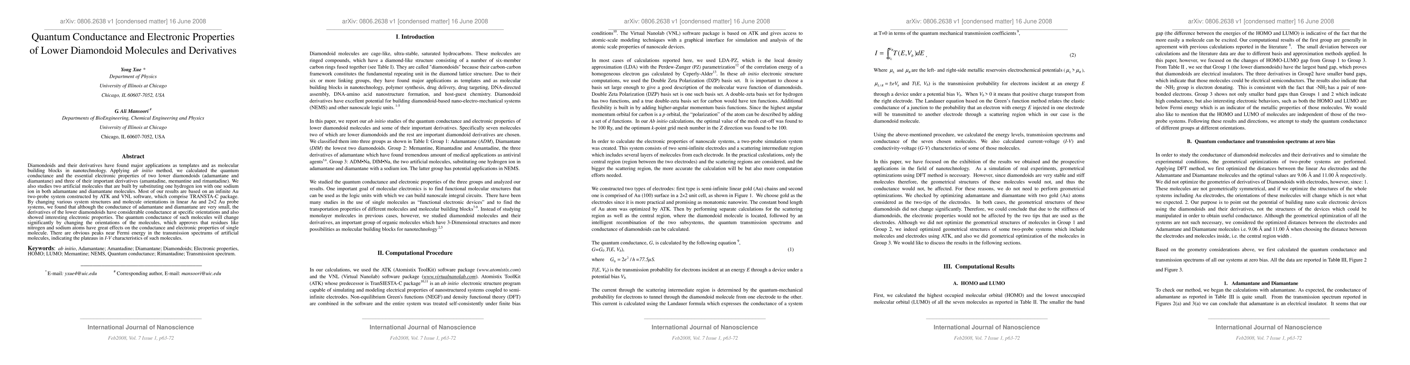 This study investigates the quantum conductance and electronic properties of lower diamondoid molecules and their derivatives using ab initio methods. The research finds that while adamantane and diamantane have low conductance, their derivatives exhibit significant conductance and interesting electronic properties depending on the molecule orientation, highlighting the influence of nitrogen and sodium atoms.