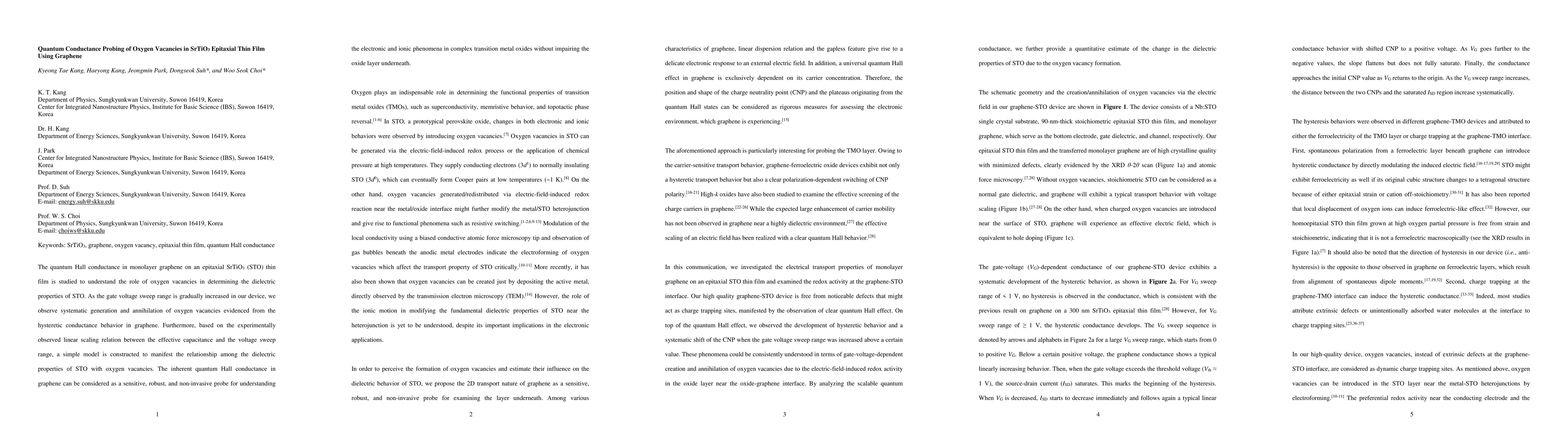 The quantum Hall conductance in monolayer graphene on an epitaxial SrTiO3 (STO) thin film is studied to understand the role of oxygen vacancies in determining the dielectric properties of STO. As the gate voltage sweep range is gradually increased in our device, we observe systematic generation and annihilation of oxygen vacancies evidenced from the hysteretic conductance behavior in graphene. Furthermore, based on the experimentally observed linear scaling relation between the effective capacitance and the voltage sweep range, a simple model is constructed to manifest the relationship among the dielectric properties of STO with oxygen vacancies. The inherent quantum Hall conductance in graphene can be considered as a sensitive, robust, and non-invasive probe for understanding the electronic and ionic phenomena in complex transition metal oxides without impairing the oxide layer underneath.