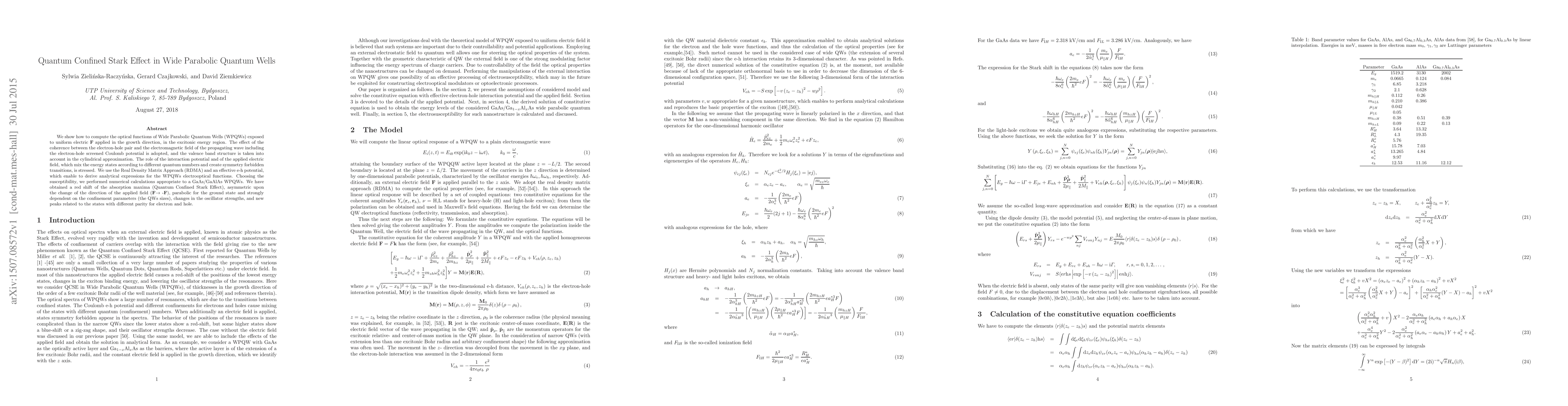 We show how to compute the optical functions of Wide Parabolic Quantum Wells (WPQWs) exposed to uniform electric F applied in the growth direction, in the excitonic energy region. The effect of the coherence between the electron-hole pair and the electromagnetic field of the propagating wave including the electron-hole screened Coulomb potential is adopted, and the valence band structure is taken into account in the cylindrical approximation. The role of the interaction potential and of the applied electric field, which mix the energy states according to different quantum numbers and create symmetry forbidden transitions, is stressed. We use the Real Density Matrix Approach (RDMA) and an effective e-h potential, which enable to derive analytical expressions for the WPQWs electrooptical functions. Choosing the susceptibility, we performed numerical calculations appropriate to a GaAs/GaAlAs WPQWs. We have obtained a red shift of the absorption maxima (Quantum Confined Stark Effect), asymmetric upon the change of the direction of the applied field (F -> -F), parabolic for the ground state and strongly dependent on the confinement parameters (the QWs sizes), changes in the oscillator strengths, and new peaks related to the states with different parity for electron and hole.