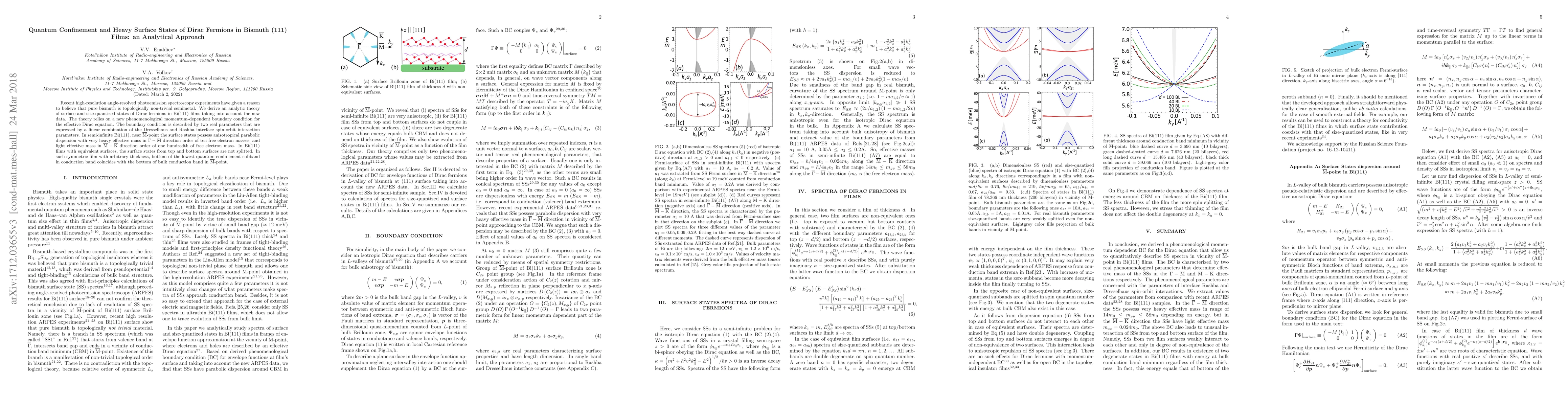 Recent high-resolution angle-resolved photoemission spectroscopy experiments have given a reason to believe that pure bismuth is topologically non-trivial semimetal. We derive an analytic theory of surface and size-quantized states of Dirac fermions in Bi(111) films taking into account the new data. The theory relies on a new phenomenological momentum-dependent boundary condition for the effective Dirac equation. The boundary condition is described by two real parameters that are expressed by a linear combination of the Dresselhaus and Rashba interface spin-orbit interaction parameters. In semi-infinite Bi(111), near $\overline{\rm M}$-point the surface states possess anisotropical parabolic dispersion with very heavy effective mass in $\overline{\rm \Gamma}-\overline{\rm M}$ direction order of ten free electron masses, and light effective mass in $\overline{\rm M}-\overline{\rm K}$ direction order of one hundredth of free electron mass. In Bi(111) films with equivalent surfaces, the surface states from top and bottom surfaces are not splitted. In such symmetric film with arbitrary thickness, bottom of the lowest quantum confinement subband in conduction band coincides with the bottom of bulk conduction band in $\overline{\rm M}$-point.