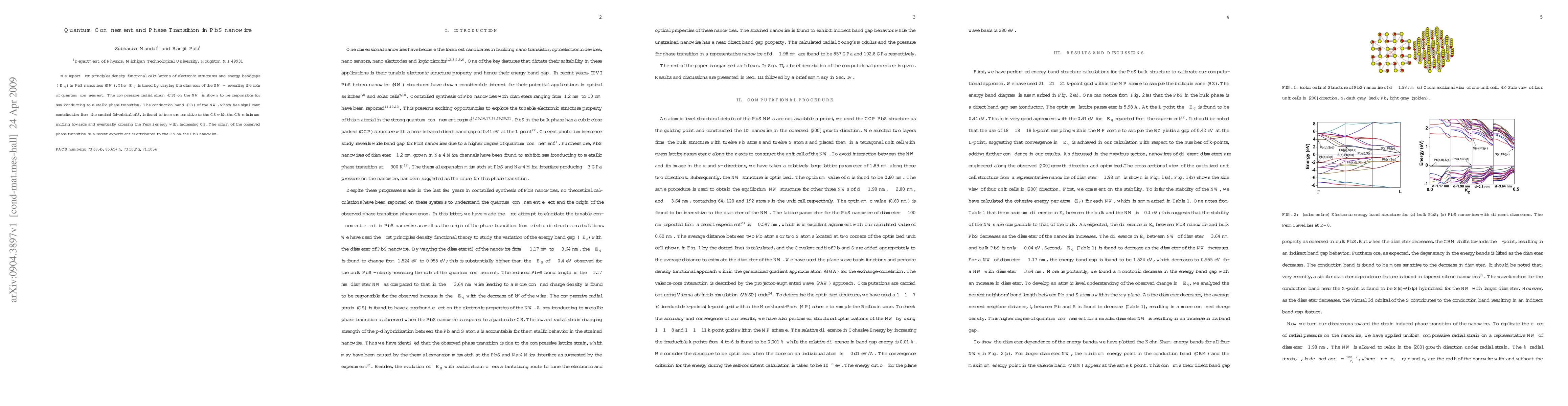 We report first principles density functional calculations of electronic structures and energy bandgaps ($\Delta E_g$) in PbS nanowires (NW). The $\Delta E_g$ is tuned by varying the diameter of the NW - {\it revealing the role of quantum confinement}. The compressive radial strain (CS) on the NW is shown to be responsible for semiconducting to metallic phase transition. The conduction band (CB) of the NW, which has significant contribution from the excited 3{\it d}-orbital of S, is found to be more sensitive to the CS with the CB minimum shifting towards and eventually crossing the Fermi energy with increasing CS. The origin of the observed phase transition in a recent experiment is attributed to the CS on the PbS nanowire.