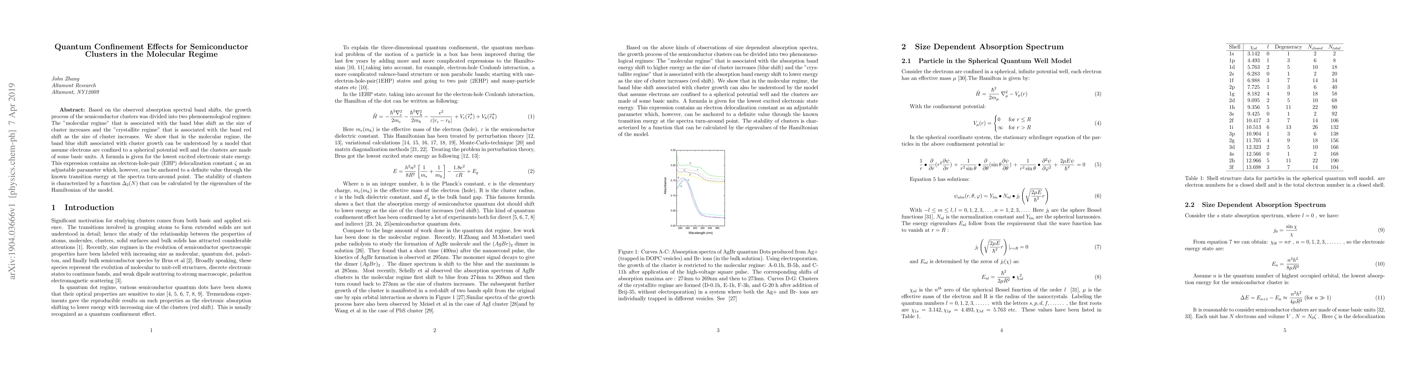 Based on the observed absorption spectral band shifts, the growth process of the semiconductor clusters was divided into two phenomenological regimes: The "molecular regime" that is associated with the band blue shift as the size of cluster increases and the "crystallite regime" that is associated with the band red shift as the size of cluster increases. We show that in the molecular regime, the band blue shift associated with cluster growth can be understood by a model that assume electrons are confined to a spherical potential well and the clusters are made of some basic units. A formula is given for the lowest excited electronic state energy. This expression contains an electron-hole-pair (EHP) delocalization constant as an adjustable parameter which, however, can be anchored to a definite value through the known transition energy at the spectra turn-around point. The stability of clusters is characterized by a function that can be calculated by the eigenvalues of the Hamiltonian of the model.