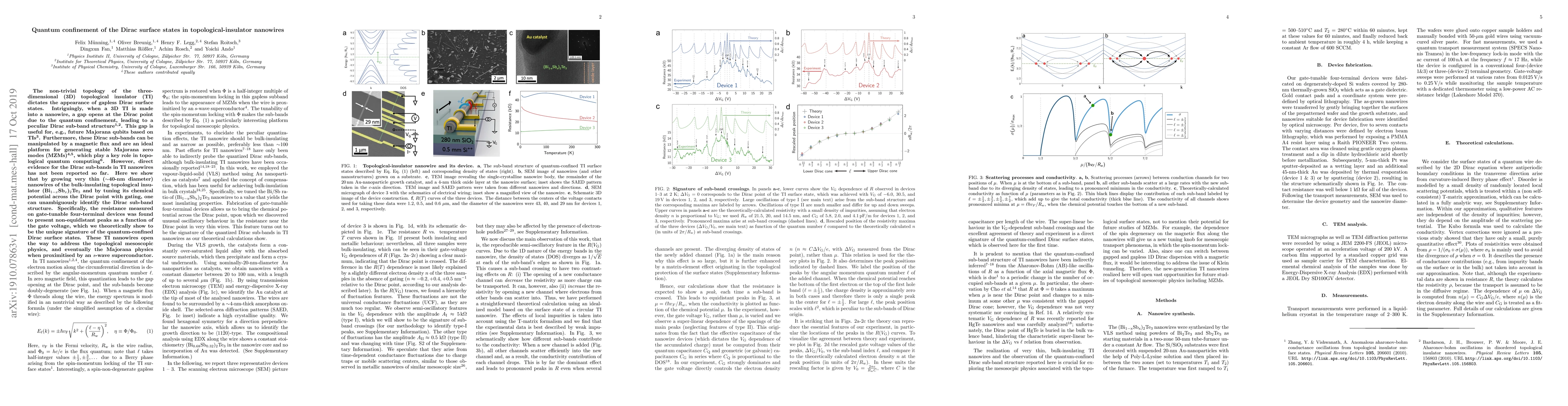 This paper demonstrates the quantum confinement of Dirac surface states in topological-insulator nanowires, revealing a gap opening at the Dirac point due to confinement. The study identifies the Dirac sub-band structure in thin nanowires of (Bi$_{1-x}$Sb$_x$)$_2$Te$_3$ through gate-tunable resistance measurements, providing a pathway for topological quantum computing via Majorana zero modes.