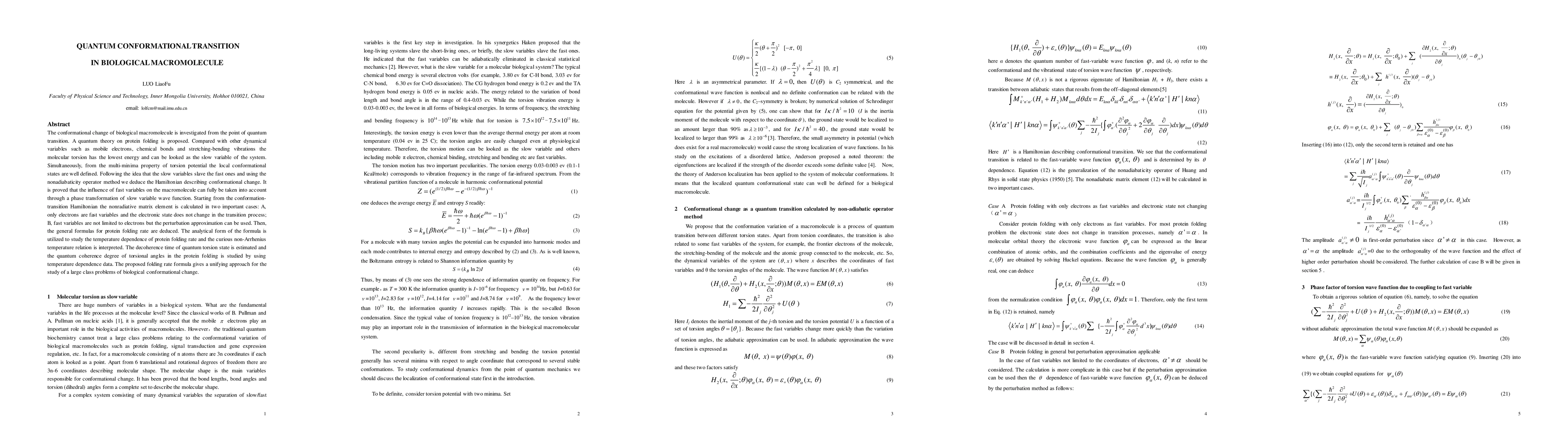 The conformational change of biological macromolecule is investigated from the point of quantum transition. A quantum theory on protein folding is proposed. Compared with other dynamical variables such as mobile electrons, chemical bonds and stretching-bending vibrations the molecular torsion has the lowest energy and can be looked as the slow variable of the system. Simultaneously, from the multi-minima property of torsion potential the local conformational states are well defined. Following the idea that the slow variables slave the fast ones and using the nonadiabaticity operator method we deduce the Hamiltonian describing conformational change. It is proved that the influence of fast variables on the macromolecule can fully be taken into account through a phase transformation of slow variable wave function. Starting from the conformation- transition Hamiltonian the nonradiative matrix element is calculated in two important cases: A, only electrons are fast variables and the electronic state does not change in the transition process; B, fast variables are not limited to electrons but the perturbation approximation can be used. Then, the general formulas for protein folding rate are deduced. The analytical form of the formula is utilized to study the temperature dependence of protein folding rate and the curious non-Arrhenius temperature relation is interpreted. The decoherence time of quantum torsion state is estimated and the quantum coherence degree of torsional angles in the protein folding is studied by using temperature dependence data. The proposed folding rate formula gives a unifying approach for the study of a large class problems of biological conformational change.