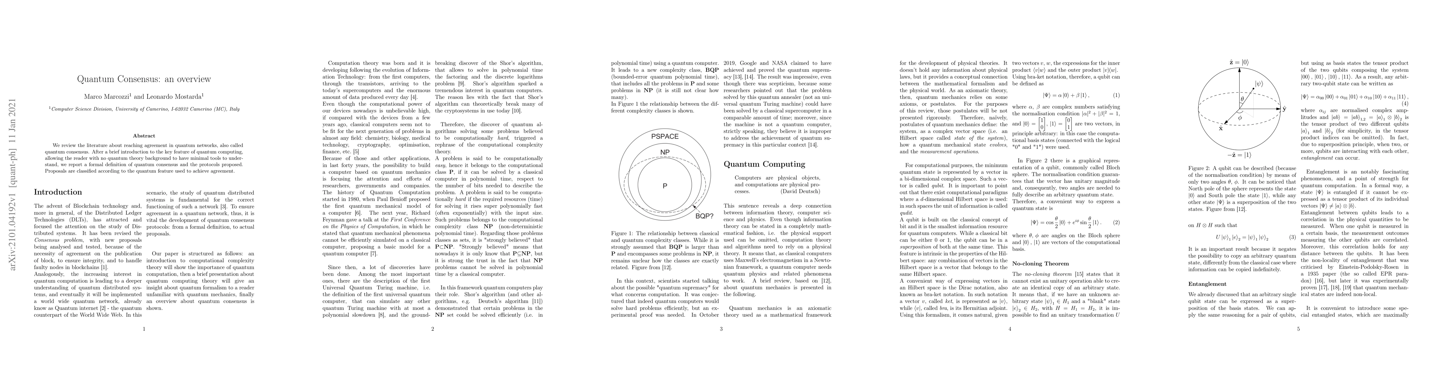 We review the literature about reaching agreement in quantum networks, also called quantum consensus. After a brief introduction to the key feature of quantum computing, allowing the reader with no quantum theory background to have minimal tools to understand, we report a formal definition of quantum consensus and the protocols proposed. Proposals are classified according to the quantum feature used to achieve agreement.