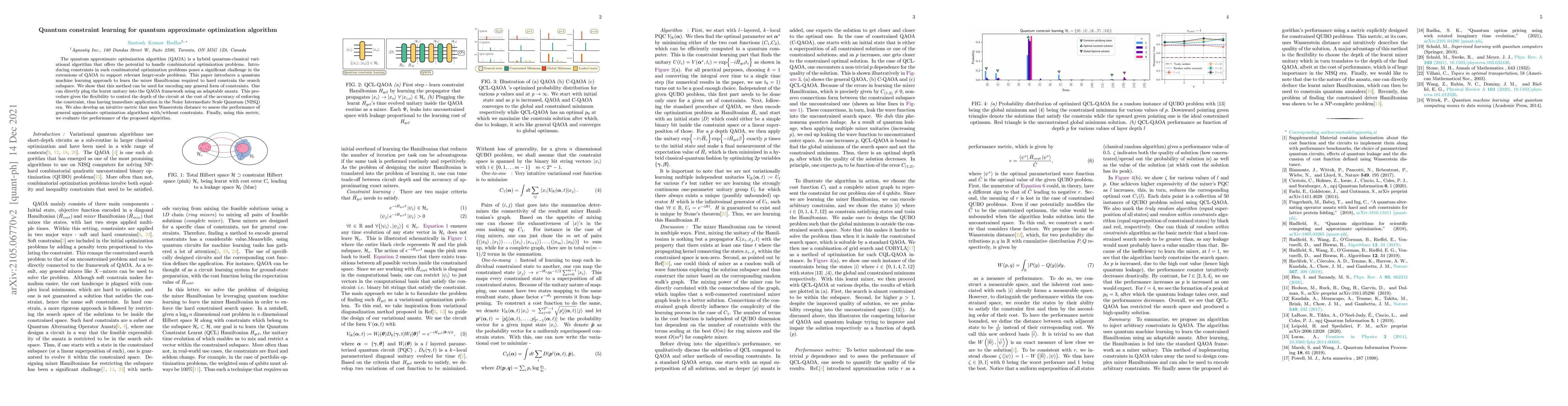 The quantum approximate optimization algorithm (QAOA) is a hybrid quantum-classical variational algorithm that offers the potential to handle combinatorial optimization problems. Introducing constraints in such combinatorial optimization problems poses a significant challenge in the extensions of QAOA to support relevant larger-scale problems. This paper introduces a quantum machine learning approach to learn the mixer Hamiltonian required to hard constrain the search subspace. We show that this method can be used for encoding any general form of constraints. One can directly plug the learnt unitary into the QAOA framework using an adaptable ansatz. This procedure gives the flexibility to control the depth of the circuit at the cost of the accuracy of enforcing the constraint, thus having immediate application in the Noisy Intermediate Scale Quantum (NISQ) era. We also develop an intuitive metric that uses Wasserstein distance to assess the performance of general approximate optimization algorithms with/without constraints. Finally, using this metric, we evaluate the performance of the proposed algorithm.