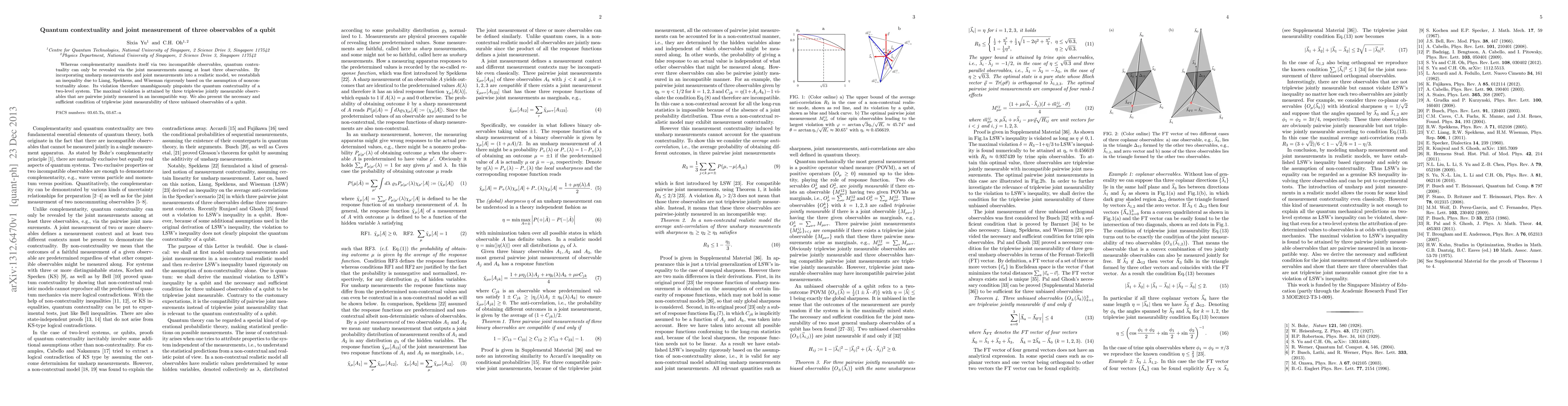 Whereas complementarity manifests itself via two incompatible observables, quantum contextuality can only be revealed via the joint measurements among at least three observables. By incorporating unsharp measurements and joint measurements into a realistic model, we reestablish an inequality due to Liang, Spekkens, and Wiseman rigorously based on the assumption of noncontextuality alone. Its violation therefore unambiguously pinpoints the quantum contextuality of a two-level system. The maximal violation is attained by three triplewise jointly measurable observables that are pairwise jointly measured in an incompatible way. We also present the necessary and sufficient condition of triplewise joint measurability of three unbiased observables of a qubit.