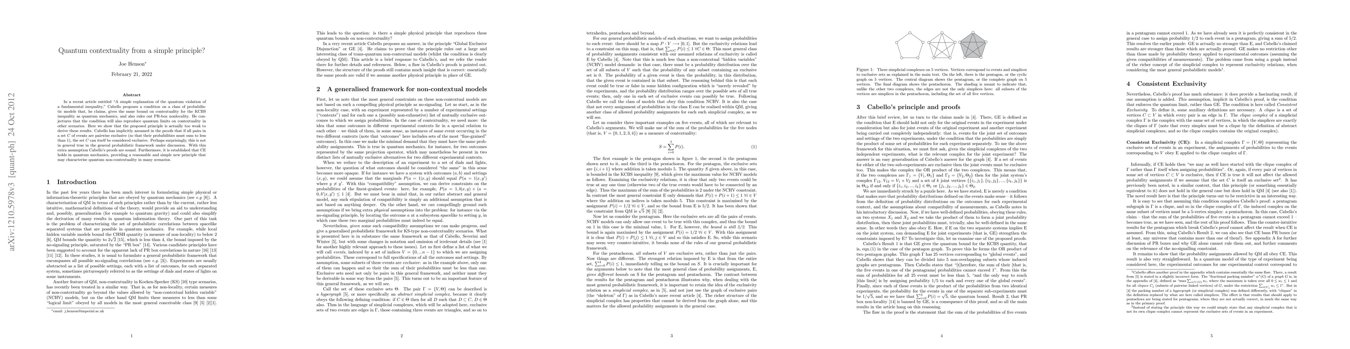 In a recent article entitled "A simple explanation of the quantum violation of a fundamental inequality," Cabello proposes a condition on a class of probabilistic models that, he claims, gives the same bound on contextuality for the KCBS inequality as quantum mechanics, and also rules out PR-box nonlocality. He conjectures that the condition will also reproduce quantum limits on contextuality in other scenarios. Here we show that the proposed principle is actually too weak to derive these results. Cabello has implicitly assumed in the proofs that if all pairs in a set of events are pairwise exclusive (so that their probabilities must sum to less than 1), the set can itself be considered exclusive. Perhaps surprisingly, this is not in general true in the general probabilistic framework under discussion. We call this hidden assumption "Consistent Exclusivity" or CE. With this extra assumption Cabello's proofs are sound. Furthermore, it is established that CE holds in quantum mechanics, providing a reasonable and simple new principle that may characterise quantum non-contextuality in many scenarios.