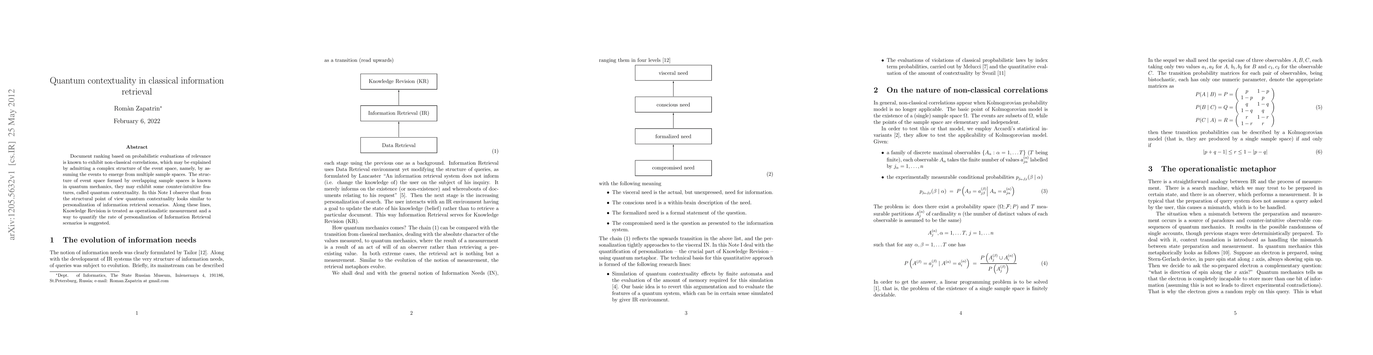 Document ranking based on probabilistic evaluations of relevance is known to exhibit non-classical correlations, which may be explained by admitting a complex structure of the event space, namely, by assuming the events to emerge from multiple sample spaces. The structure of event space formed by overlapping sample spaces is known in quantum mechanics, they may exhibit some counter-intuitive features, called quantum contextuality. In this Note I observe that from the structural point of view quantum contextuality looks similar to personalization of information retrieval scenarios. Along these lines, Knowledge Revision is treated as operationalistic measurement and a way to quantify the rate of personalization of Information Retrieval scenarios is suggested.