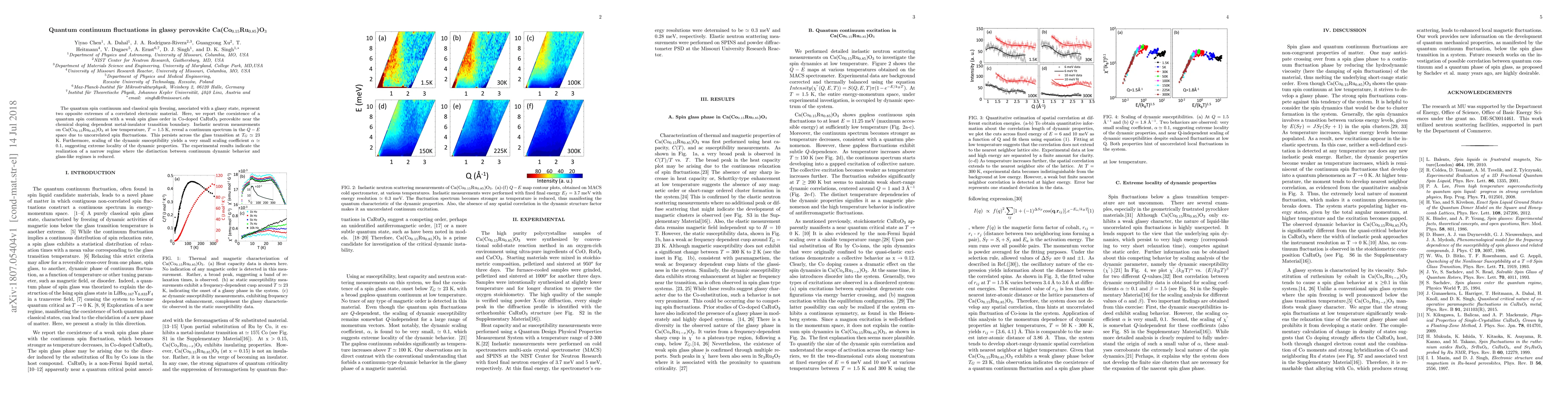 The quantum spin continuum and classical spin freezing, associated with a glassy state, represent two opposite extremes of a correlated electronic material. Here, we report the coexistence of a quantum spin continuum with a weak spin glass order in Co-doped CaRuO$_{3}$ perovskite near the chemical doping dependent metal-insulator transition boundary. Inelastic neutron measurements on Ca(Co$_{0.15}$Ru$_{0.85}$)O$_{3}$ at low temperature, $T$ = 1.5 K, reveal a continuum spectrum in the $Q-E$ space due to uncorrelated spin fluctuations. This persists across the glass transition at $T_G \simeq$23 K. Furthermore, scaling of the dynamic susceptibility yields a very small scaling coefficient $\alpha$ $\simeq$ 0.1, suggesting extreme locality of the dynamic properties. The experimental results indicate the realization of a narrow regime where the distinction between continuum dynamic behavior and glass-like regimes is reduced.