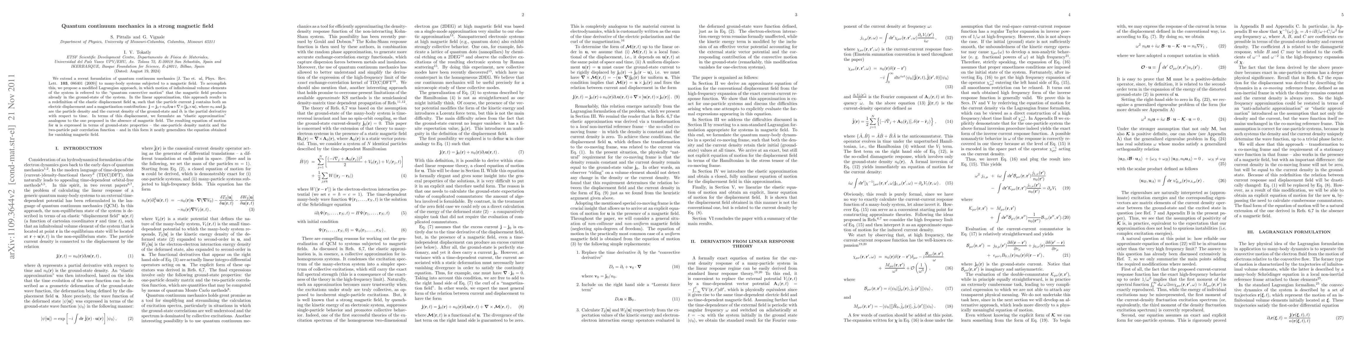 We extend a recent formulation of quantum continuum mechanics [J. Tao et. al, Phys. Rev. Lett. {\bf 103}, 086401 (2009)] to many-body systems subjected to a magnetic field. To accomplish this, we propose a modified Lagrangian approach, in which motion of infinitesimal volume elements of the system is referred to the "quantum convective motion" that the magnetic field produces already in the ground-state of the system. In the linear approximation, this approach results in a redefinition of the elastic displacement field $\uv$, such that the particle current $\jv$ contains both an electric displacement and a magnetization contribution: $\jv=\jv_0+n_0\partial_t \uv+\nabla \times (\jv_0\times \uv)$, where $n_0$ and $\jv_0$ are the particle density and the current density of the ground-state and $\partial_t$ is the partial derivative with respect to time. In terms of this displacement, we formulate an "elastic approximation" analogous to the one proposed in the absence of magnetic field. The resulting equation of motion for $\uv$ is expressed in terms of ground-state properties -- the one-particle density matrix and the two-particle pair correlation function -- and in this form it neatly generalizes the equation obtained for vanishing magnetic field.