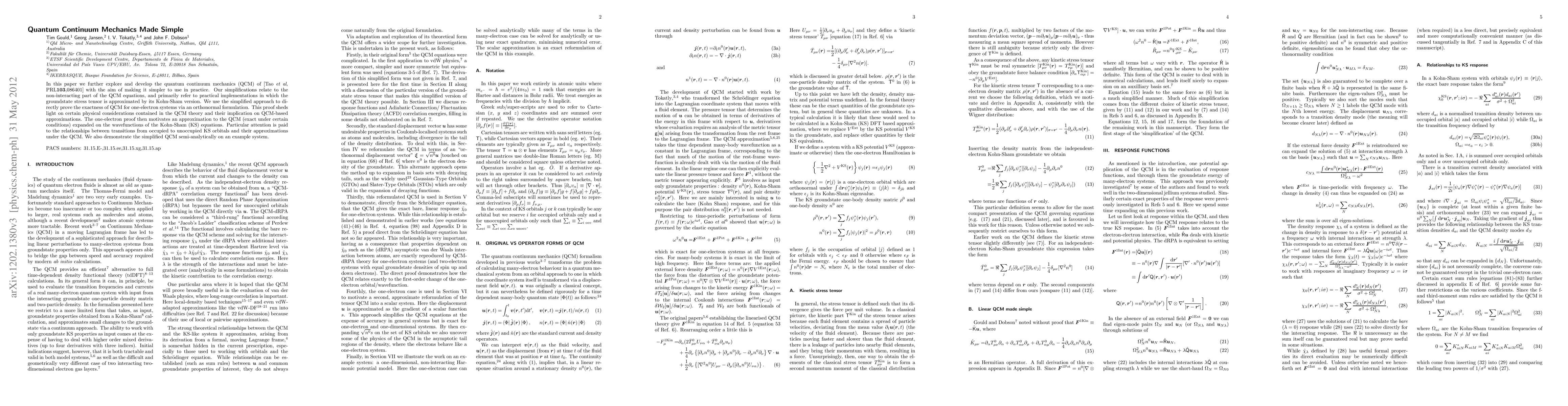In this paper we further explore and develop the quantum continuum mechanics (CM) of [Tao \emph{et al}, PRL{\bf 103},086401] with the aim of making it simpler to use in practice. Our simplifications relate to the non-interacting part of the CM equations, and primarily refer to practical implementations in which the groundstate stress tensor is approximated by its Kohn-Sham version. We use the simplified approach to directly prove the exactness of CM for one-electron systems via an orthonormal formulation. This proof sheds light on certain physical considerations contained in the CM theory and their implication on CM-based approximations. The one-electron proof then motivates an approximation to the CM (exact under certain conditions) expanded on the wavefunctions of the Kohn-Sham (KS) equations. Particular attention is paid to the relationships between transitions from occupied to unoccupied KS orbitals and their approximations under the CM. We also demonstrate the simplified CM semi-analytically on an example system.