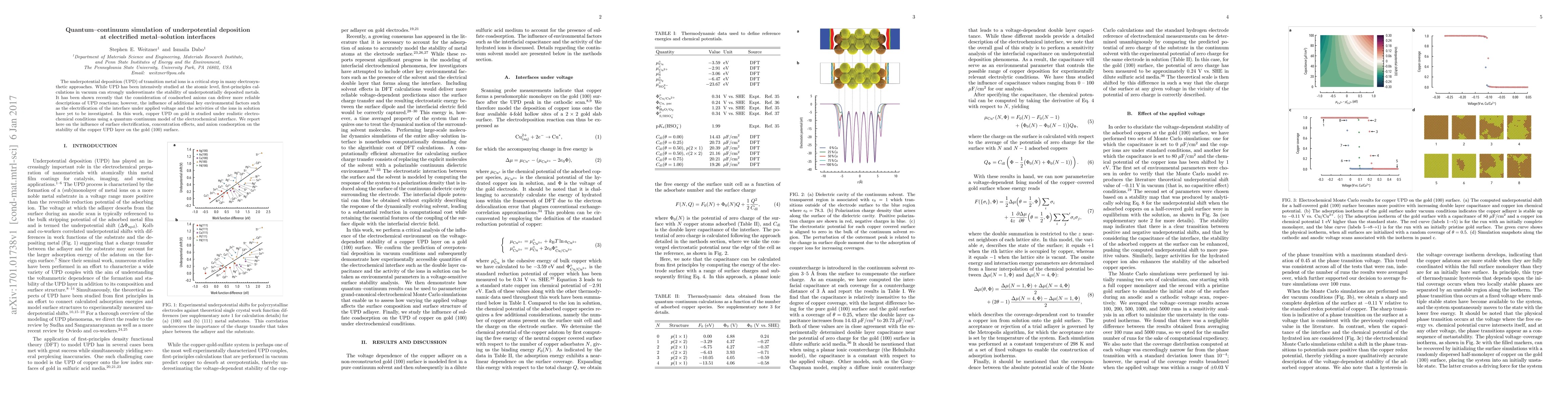 This paper investigates the quantum-continuum simulation of copper underpotential deposition on gold under electrochemical conditions, focusing on the effects of surface electrification, ion concentration, and anion co-adsorption on the stability of the deposited layer. The study reveals how these factors influence the stability of underpotentially deposited metals beyond vacuum-based first-principles calculations.