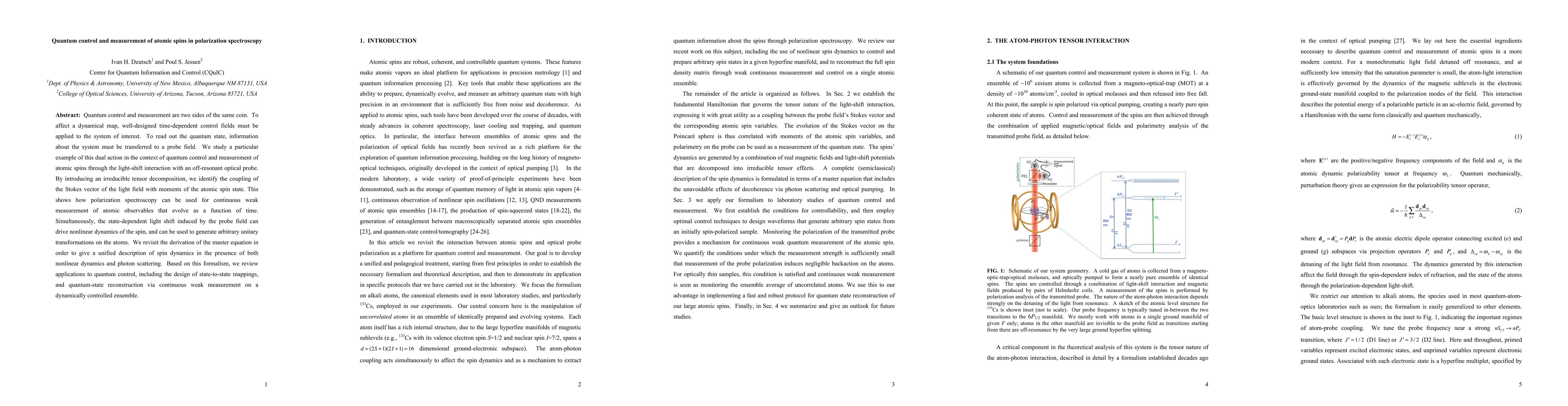 This paper explores quantum control and measurement of atomic spins using polarization spectroscopy, demonstrating how off-resonant optical probes can induce continuous weak measurements and drive nonlinear dynamics. It introduces a formalism to describe spin dynamics under both nonlinear transformations and photon scattering, and applies this to quantum control tasks like state-to-state mappings and quantum-state reconstruction.