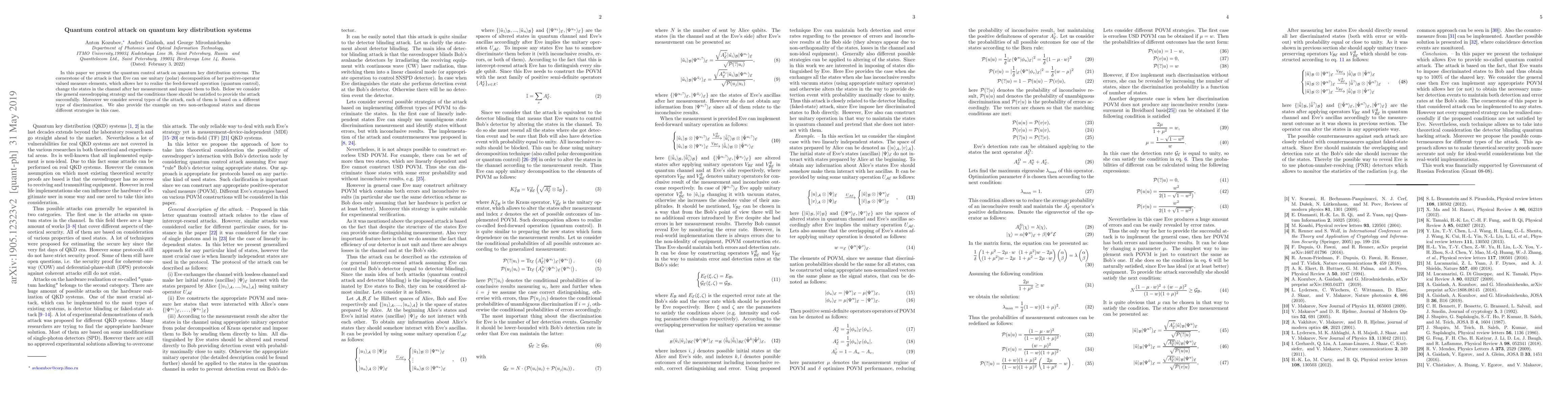 This paper introduces a quantum control attack on quantum key distribution systems, where Eve exploits unitary decomposition to manipulate channel states post-measurement and feed-forward control, detailing various discrimination-based attack types and providing an example with non-orthogonal states.
