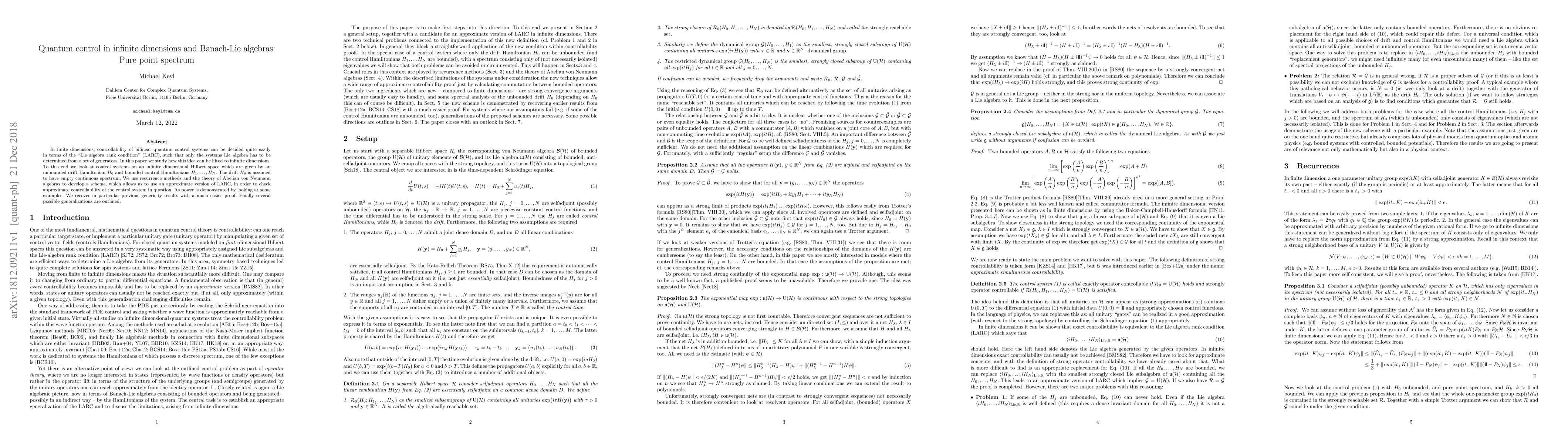 This paper extends the Lie algebra rank condition (LARC) for controllability from finite to infinite dimensions, focusing on quantum control systems in infinite-dimensional Hilbert spaces. The authors develop a scheme using recurrence methods and Abelian von Neumann algebras to establish approximate controllability, demonstrating its effectiveness through examples and simplifying previous genericity results.