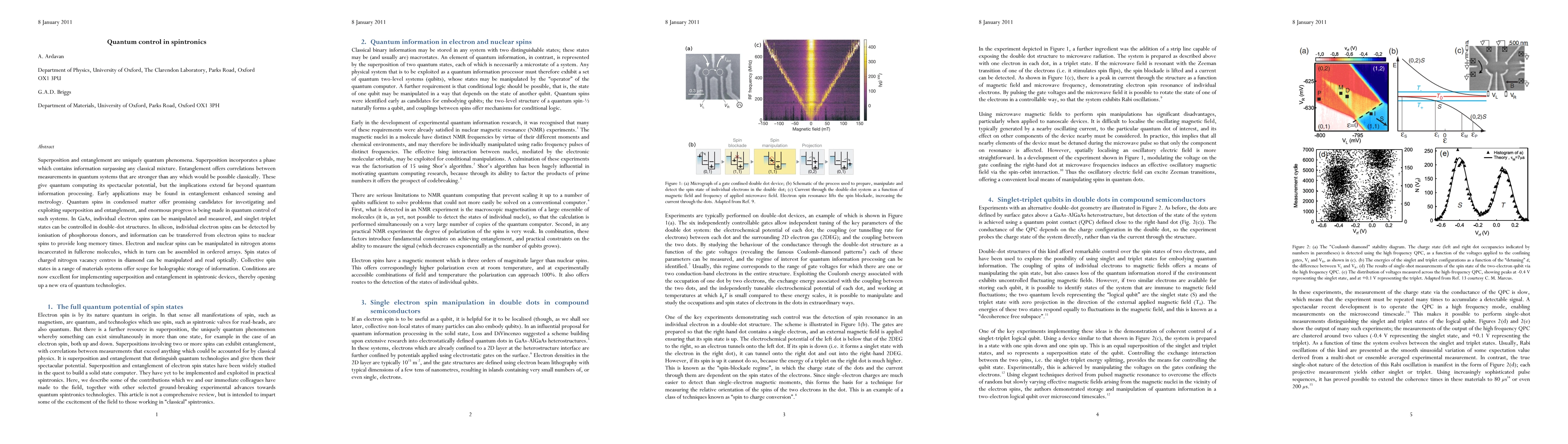 Superposition and entanglement are uniquely quantum phenomena. Superposition incorporates a phase which contains information surpassing any classical mixture. Entanglement offers correlations between measurements in quantum systems that are stronger than any which would be possible classically. These give quantum computing its spectacular potential, but the implications extend far beyond quantum information processing. Early applications may be found in entanglement enhanced sensing and metrology. Quantum spins in condensed matter offer promising candidates for investigating and exploiting superposition and entanglement, and enormous progress is being made in quantum control of such systems. In GaAs, individual electron spins can be manipulated and measured, and singlet-triplet states can be controlled in double-dot structures. In silicon, individual electron spins can be detected by ionisation of phosphorous donors, and information can be transferred from electron spins to nuclear spins to provide long memory times. Electron and nuclear spins can be manipulated in nitrogen atoms incarcerated in fullerene molecules, which in turn can be assembled in ordered arrays. Spin states of charged nitrogen vacancy centres in diamond can be manipulated and read optically. Collective spin states in a range of materials systems offer scope for holographic storage of information. Conditions are now excellent for implementing superposition and entanglement in spintronic devices, thereby opening up a new era of quantum technologies.