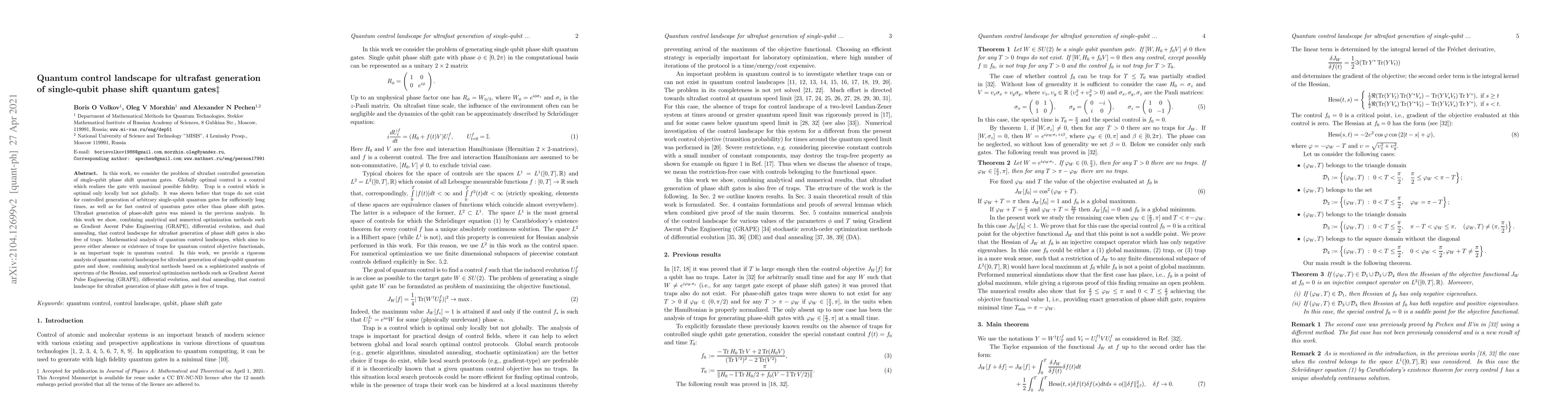 This paper investigates the optimal control landscape for ultrafast generation of single-qubit phase shift quantum gates, demonstrating through a combination of analytical and numerical methods that there are no local traps, thus ensuring globally optimal control. The study employs techniques like Gradient Ascent Pulse Engineering (GRAPE) and differential evolution to rigorously prove the absence of traps.