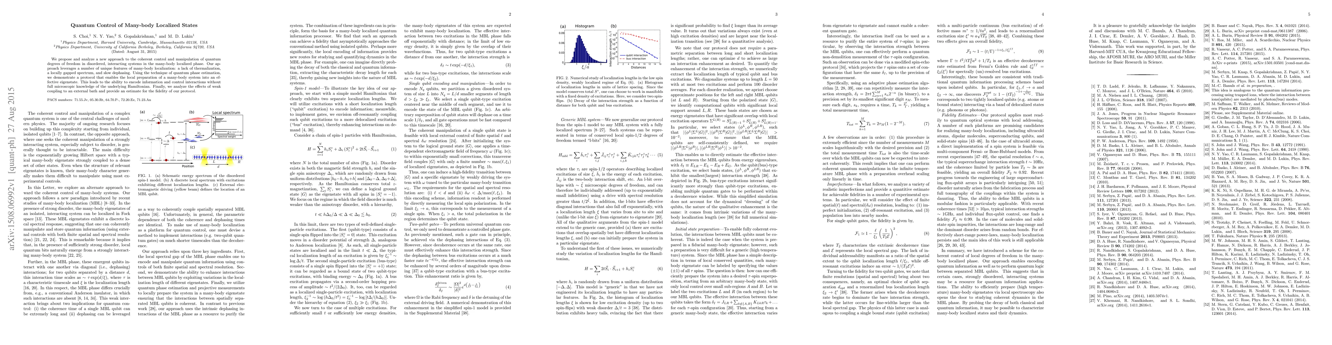 We propose and analyze a new approach to the coherent control and manipulation of quantum degrees of freedom in disordered, interacting systems in the many-body localized phase. Our approach leverages a number of unique features of many-body localization: a lack of thermalization, a locally gapped spectrum, and slow dephasing. Using the technique of quantum phase estimation, we demonstrate a protocol that enables the local preparation of a many-body system into an effective eigenstate. This leads to the ability to encode information and control interactions without full microscopic knowledge of the underlying Hamiltonian. Finally, we analyze the effects of weak coupling to an external bath and provide an estimate for the fidelity of our protocol.