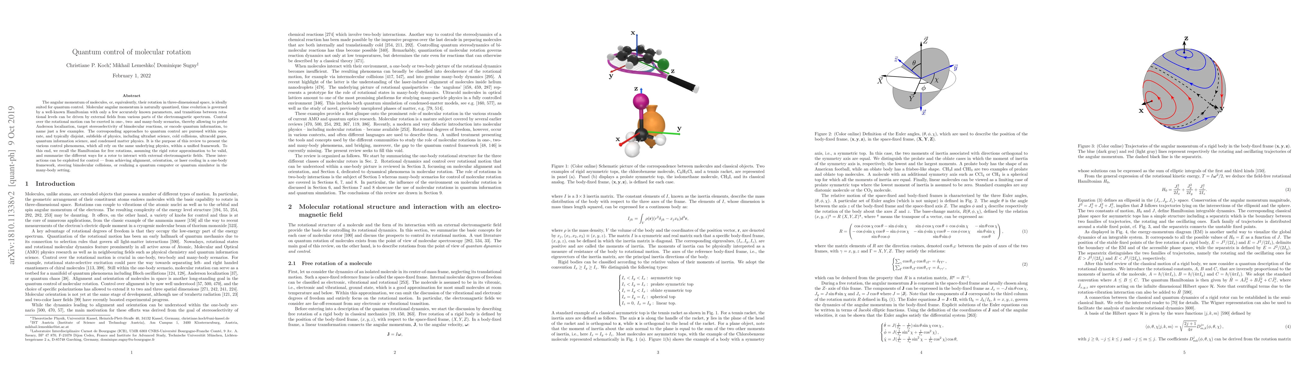 This review paper explores how quantum control can be applied to molecular rotation in various one-, two-, and many-body scenarios, enabling applications such as stereoselectivity and quantum information encoding.
