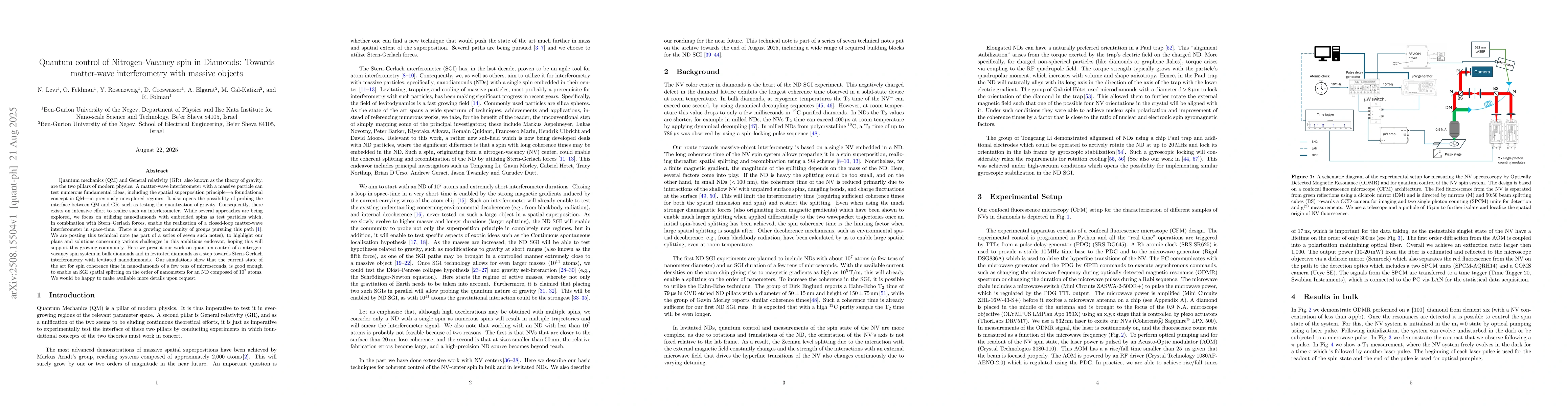 Quantum mechanics (QM) and General relativity (GR), also known as the theory of gravity, are the two pillars of modern physics. A matter-wave interferometer with a massive particle can test numerous fundamental ideas, including the spatial superposition principle - a foundational concept in QM - in previously unexplored regimes. It also opens the possibility of probing the interface between QM and GR, such as testing the quantization of gravity. Consequently, there exists an intensive effort to realize such an interferometer. While several approaches are being explored, we focus on utilizing nanodiamonds with embedded spins as test particles which, in combination with Stern-Gerlach forces, enable the realization of a closed-loop matter-wave interferometer in space-time. There is a growing community of groups pursuing this path [1]. We are posting this technical note (as part of a series of seven such notes), to highlight our plans and solutions concerning various challenges in this ambitious endeavor, hoping this will support this growing community. Here we present our work on quantum control of a nitrogen-vacancy spin system in bulk diamonds and in levitated diamonds as a step towards Stern-Gerlach interferometry with levitated nanodiamonds. Our simulations show that the current state of the art for spin coherence time in nanodiamonds of a few tens of microseconds, is good enough to enable an SGI spatial splitting on the order of nanometers for an ND composed of 10^7 atoms. We would be happy to make available more details upon request.