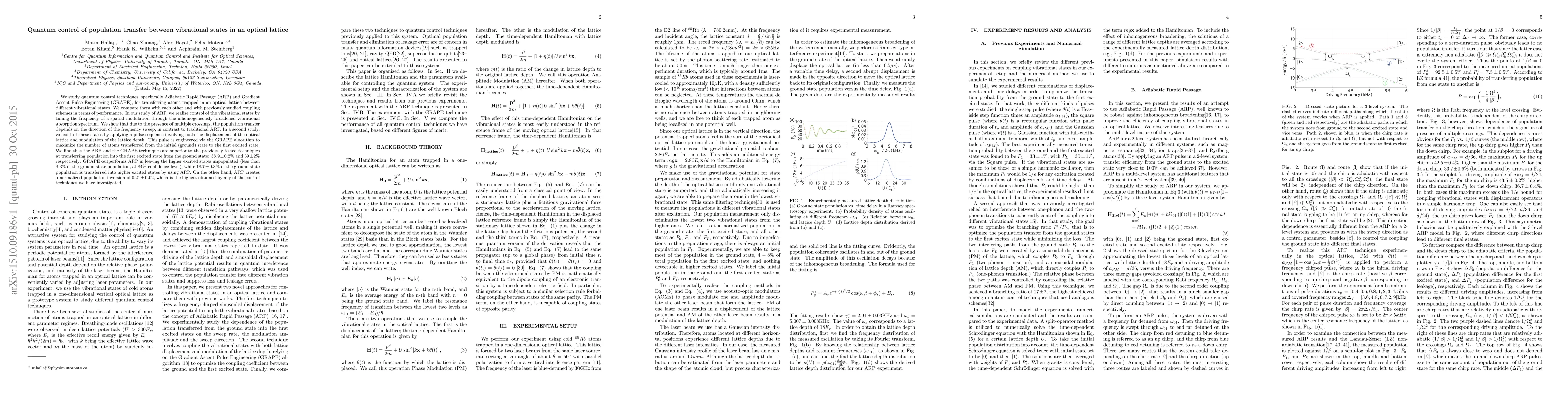 This paper explores quantum control techniques, Adiabatic Rapid Passage (ARP) and Gradient Ascent Pulse Engineering (GRAPE), for transferring atoms in an optical lattice between vibrational states. ARP and GRAPE outperform previous methods, achieving $38.9\pm0.2\%$ and $39\pm2\%$ population transfer to the first excited state, respectively, while GRAPE minimizes population in higher excited states.