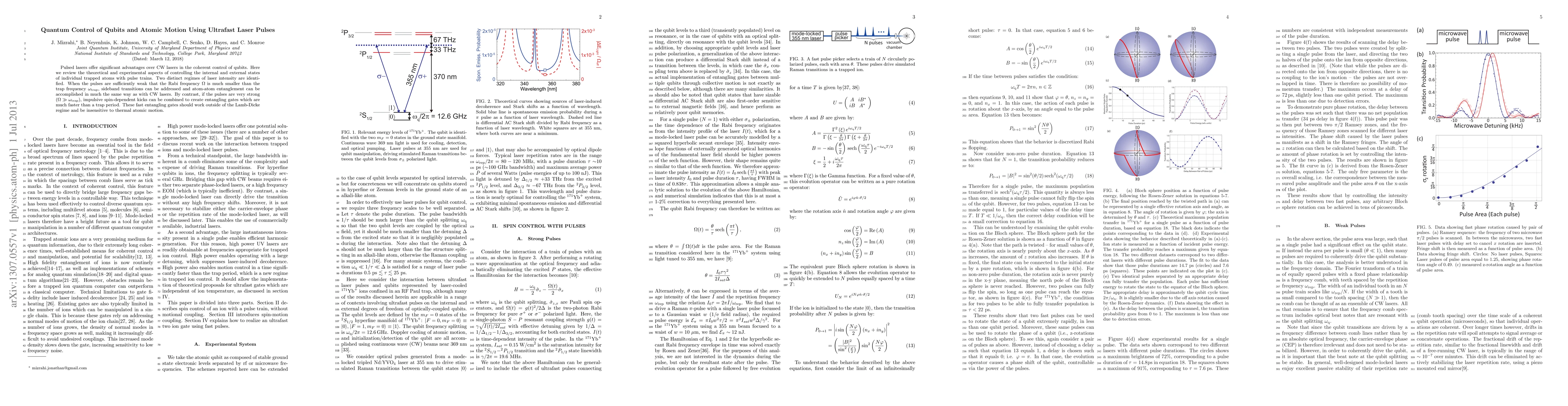 This paper reviews the use of ultrafast laser pulses to control qubits and atomic motion, identifying two regimes: weak pulses for sideband transitions and entanglement, and strong pulses for fast, spin-dependent entangling gates that operate outside the Lamb-Dicke regime and are unaffected by thermal motion.