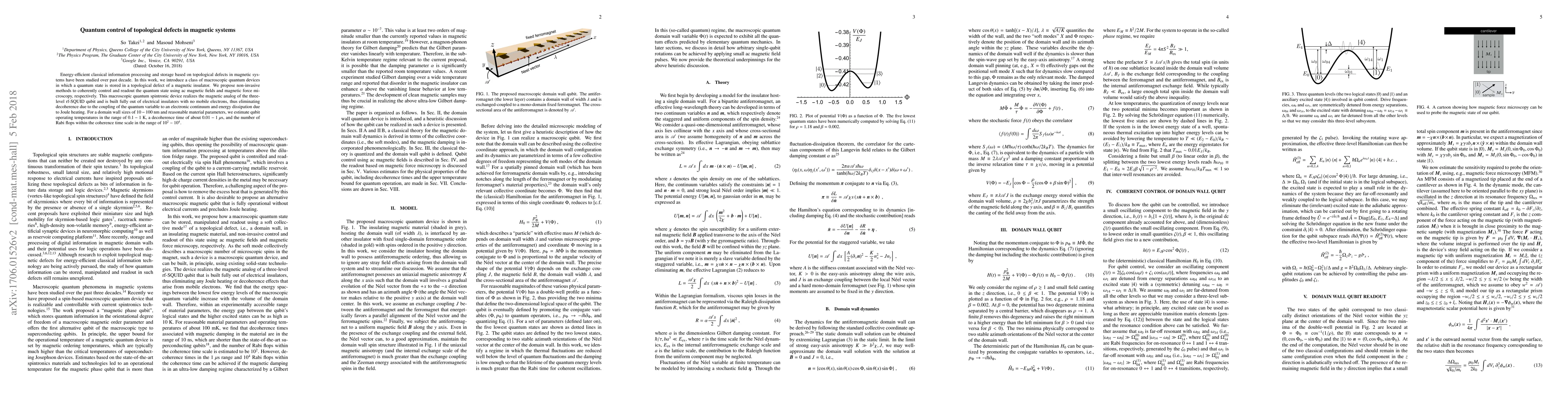 Energy-efficient classical information processing and storage based on topological defects in magnetic systems have been studied over past decade. In this work, we introduce a class of macroscopic quantum devices in which a quantum state is stored in a topological defect of a magnetic insulator. We propose non-invasive methods to coherently control and readout the quantum state using ac magnetic fields and magnetic force microscopy, respectively. This macroscopic quantum spintronic device realizes the magnetic analog of the three-level rf-SQUID qubit and is built fully out of electrical insulators with no mobile electrons, thus eliminating decoherence due to the coupling of the quantum variable to an electronic continuum and energy dissipation due to Joule heating. For a domain wall sizes of $10-100$~nm and reasonable material parameters, we estimate qubit operating temperatures in the range of $0.1-1$~K, a decoherence time of about $0.01-1$~$\mu$s, and the number of Rabi flops within the coherence time scale in the range of $10^{2}-10^{4}$.