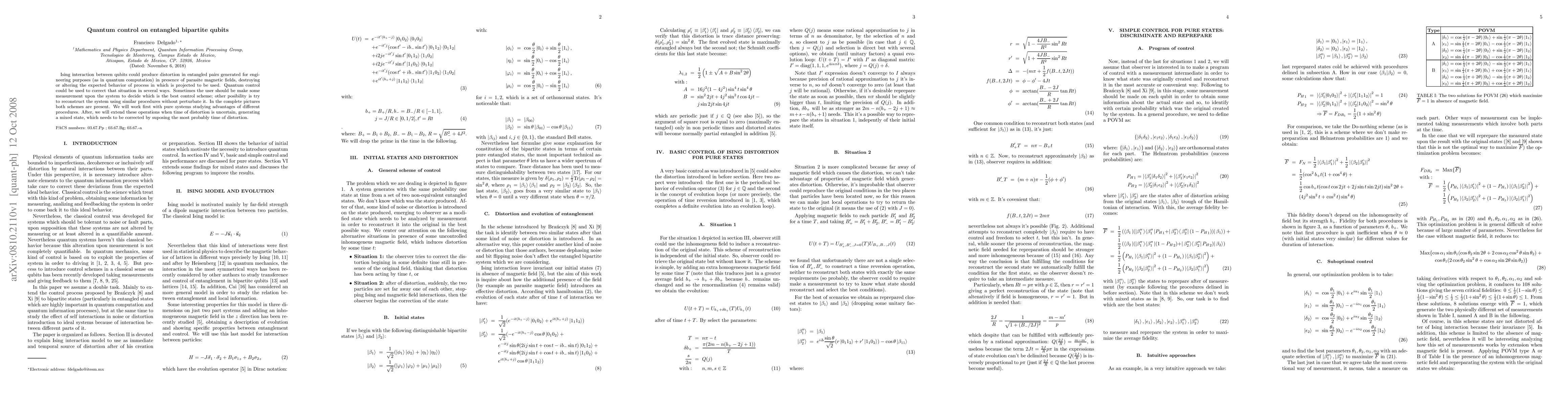 Ising interaction between qubits could produce distortion in entangled pairs generated for engineering purposes (as in quantum computation) in presence of parasite magnetic fields, destroying or altering the expected behavior of process in which is projected to be used. Quantum control could be used to correct that situation in several ways. Sometimes the user should be make some measurement upon the system to decide which is the best control scheme; other posibility is try to reconstruct the system using similar procedures without perturbate it. In the complete pictures both schemes are present. We will work first with pure systems studying advantages of different procedures. After, we will extend these operations when time of distortion is uncertain, generating a mixed state, which needs to be corrected by suposing the most probably time of distortion.
