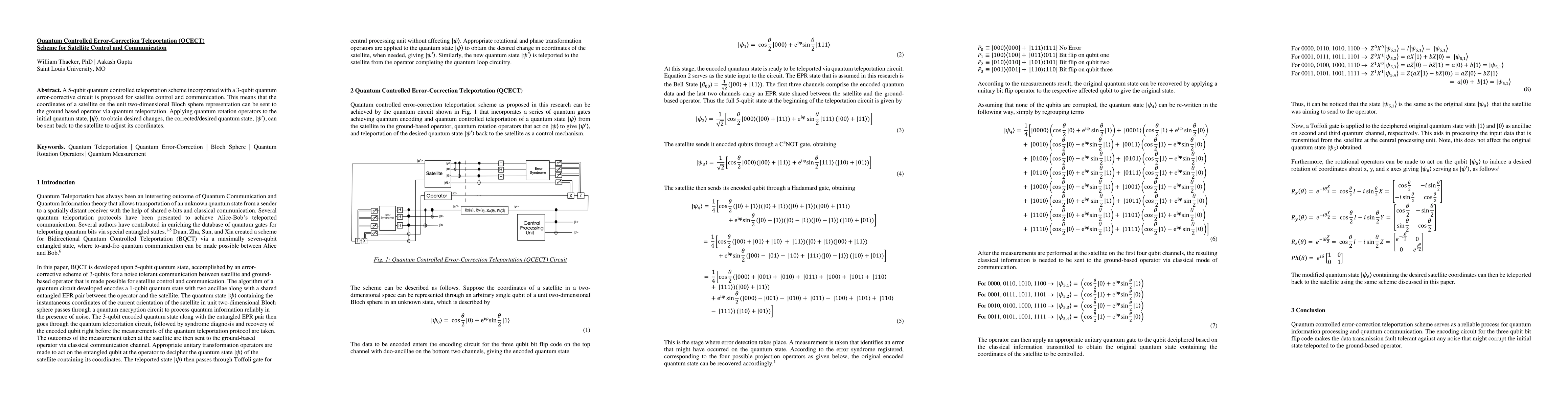 A 5-qubit quantum controlled teleportation scheme incorporated with a 3-qubit quantum error-corrective circuit is proposed for satellite control and communication. This means that the coordinates of a satellite on the unit two-dimensional Bloch sphere representation can be sent to the ground based operator via quantum teleportation. Applying quantum rotation operators to the initial quantum state, to obtain desired changes, the corrected/desired quantum state can be sent back to the satellite to adjust its coordinates.