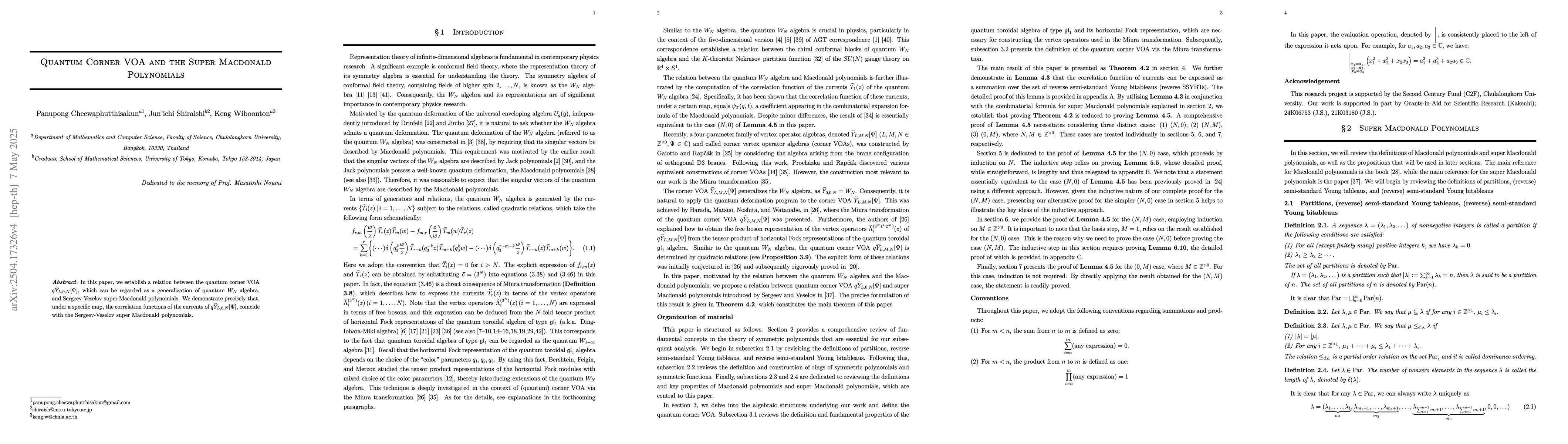 The research methodology involves establishing a relation between the quantum corner VOA $q\widetilde{Y}_{L,0,N}[\Psi]$ and Sergeev-Veselov super Macdonald polynomials, demonstrating that correlation functions of the currents of $q\widetilde{Y}_{L,0,N}[\Psi]$ coincide with these polynomials under a specific map.