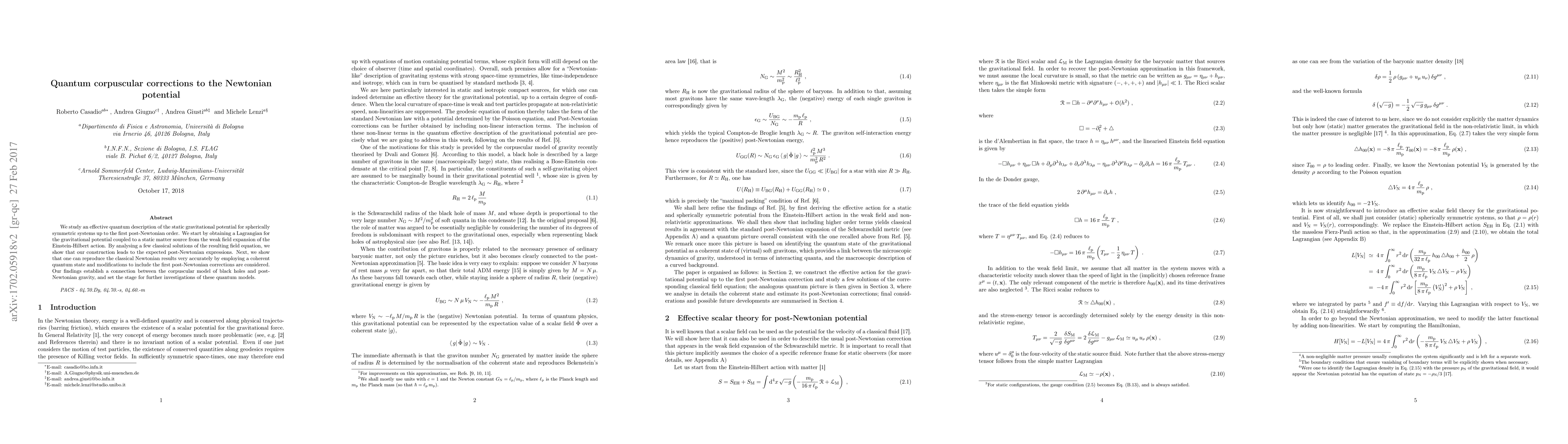 The paper presents a detailed quantum description of the static gravitational potential up to the first post-Newtonian order, connecting corpuscular black hole models with post-Newtonian gravity.