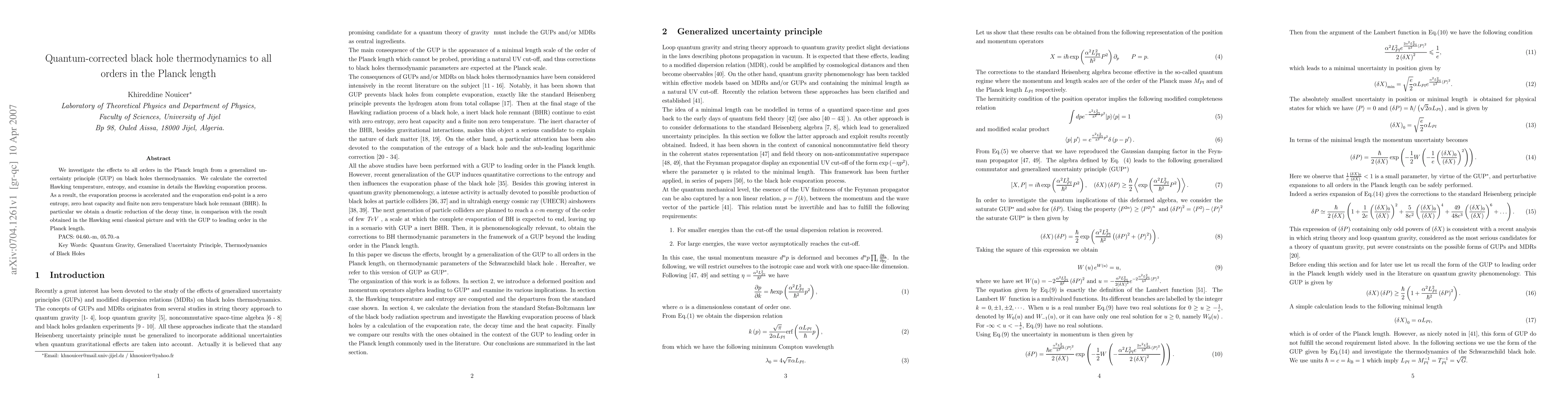 This paper explores quantum corrections to black hole thermodynamics up to all orders in the Planck length, revealing an accelerated evaporation process and concluding with a zero entropy, zero heat capacity black hole remnant (BHR) of finite non-zero temperature, significantly reducing the decay time compared to semi-classical results.