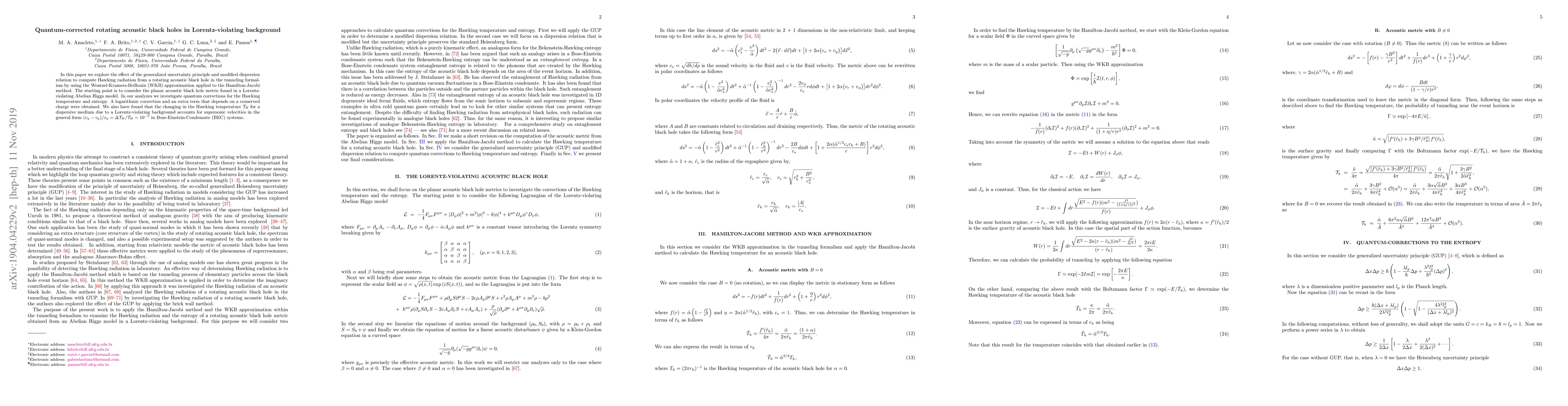 In this paper we explore the effect of the generalized uncertainty principle and modified dispersion relation to compute Hawking radiation from a rotating acoustic black hole in the tunneling formalism by using the Wentzel-Kramers-Brillouin (WKB) approximation applied to the Hamilton-Jacobi method. The starting point is to consider the planar acoustic black hole metric found in a Lorentz-violating Abelian Higgs model. In our analyzes we investigate quantum corrections for the Hawking temperature and entropy. A logarithmic correction and an extra term that depends on a conserved charge were obtained. We also have found that the changing in the Hawking temperature ${\cal T}_H$ for a dispersive medium due to a Lorentz-violating background accounts for supersonic velocities in the general form $(v_g-v_p)/v_p = \Delta {\cal T}_H/{\cal T}_H\sim10^{-5}$ in Bose-Einstein-Condensate (BEC) systems.