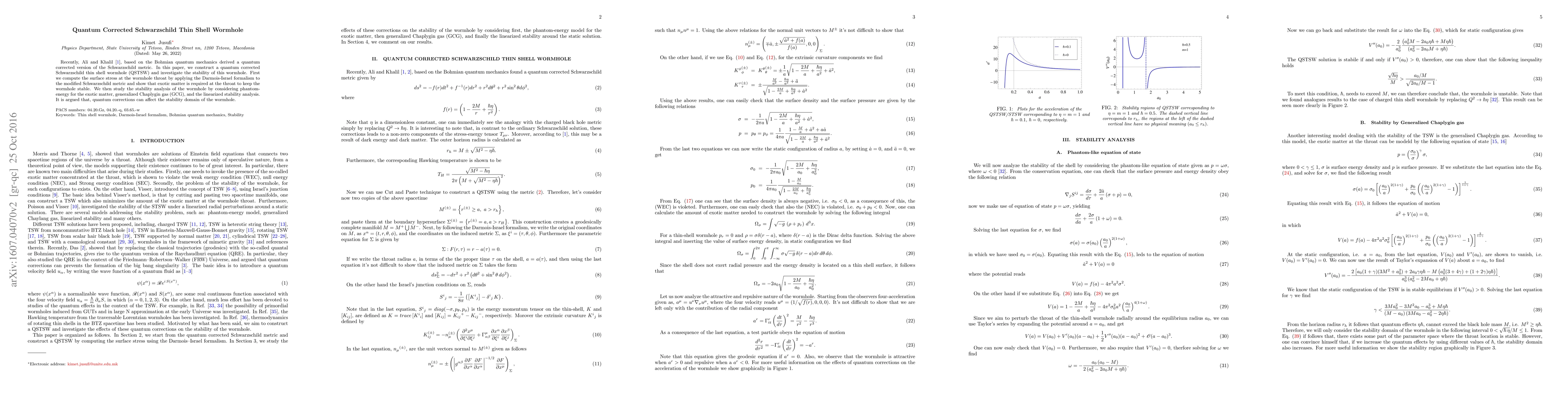 This paper constructs a quantum corrected Schwarzschild thin shell wormhole (QSTSW) and examines its stability, finding that exotic matter is necessary to maintain stability. The study explores stability using phantom-energy, generalized Chaplygin gas, and linearized analysis, concluding that quantum corrections influence the wormhole's stability domain.