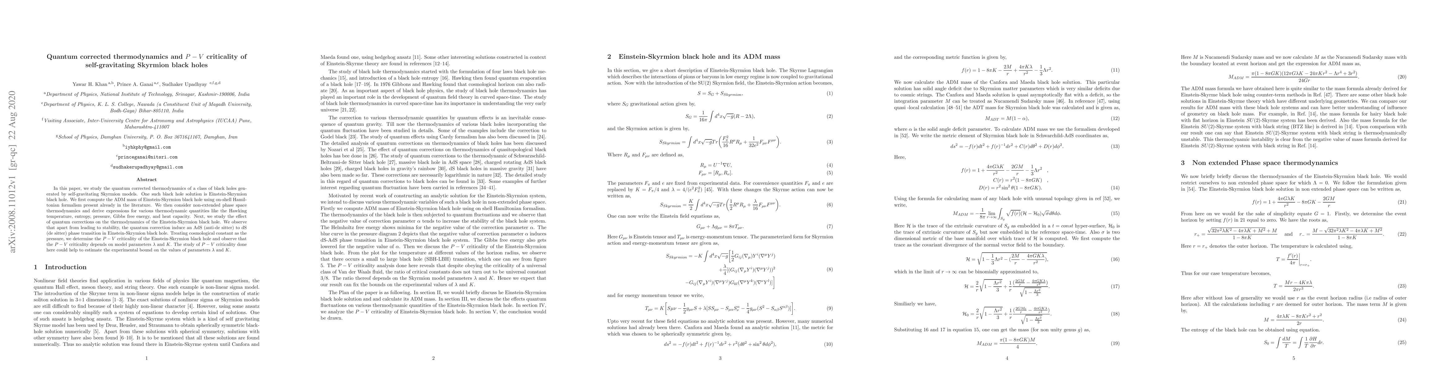 In this paper, we study the quantum corrected thermodynamics of a class of black holes generated by self-gravitating Skyrmion models. One such black hole solution is Einstein-Skrymion black hole. We first compute the ADM mass of Einstein-Skyrmion black hole using on-shell Hamiltonian formalism present already in the literature. We then consider non-extended phase space thermodynamics and derive expressions for various thermodynamic quantities like the Hawking temperature, entropy, pressure, Gibbs free energy, and heat capacity. Next, we study the effect of quantum corrections on the thermodynamics of the Einstein-Skyrmion black hole. We observe that apart from leading to stability, the quantum correction induce an AdS (anti-de sitter) to dS (de Sitter) phase transition in Einstein-Skrymion black hole. Treating cosmological constant as the pressure, we determine the $P-V$ criticality of the Einstein-Skrymion black hole and observe that the $P-V$ criticality depends on model parameters $\lambda$ and $K$. The study of $P-V$ criticality done here could help to estimate the experimental bound on the values of parameters $\lambda$ and $K$.