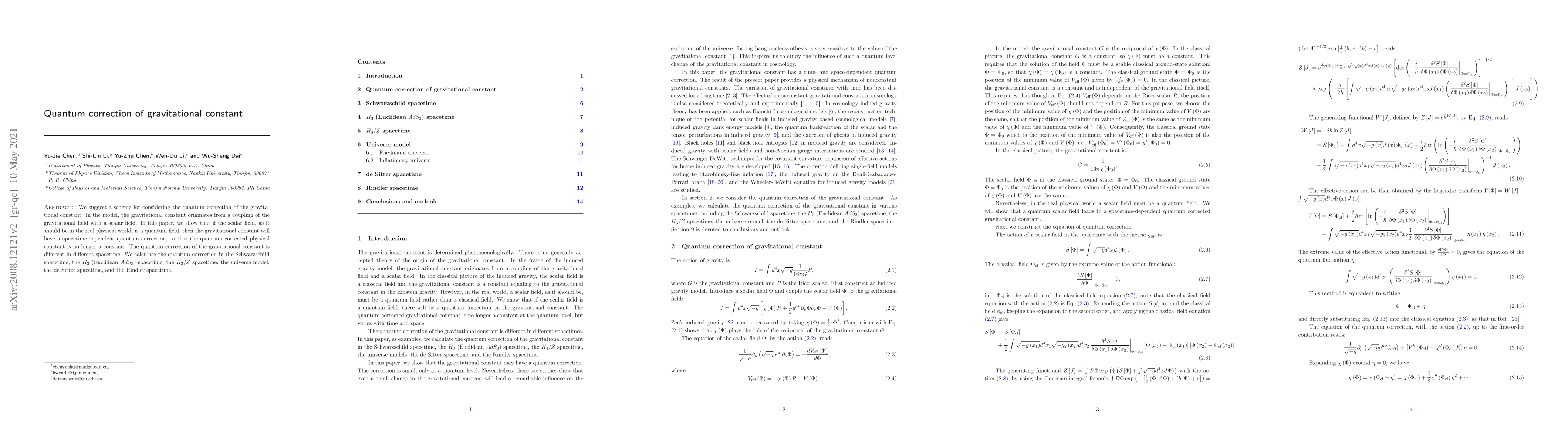 We suggest a scheme for considering the quantum correction of the gravitational constant. In the model, the gravitational constant originates from a coupling of the gravitational field with a scalar field. In this paper, we show that if the scalar field, as it should be in the real physical world, is a quantum field, then the gravitational constant will have a spacetime-dependent quantum correction, so that the quantum corrected physical constant is no longer a constant. The quantum correction of the gravitational constant is different in different spacetime. We calculate the quantum correction in the Schwarzschild spacetime, the $H_{3}$ (Euclidean $AdS_{3}$) spacetime, the $H_{3}/Z$ spacetime, the universe model, the de Sitter spacetime, and the Rindler spacetime.