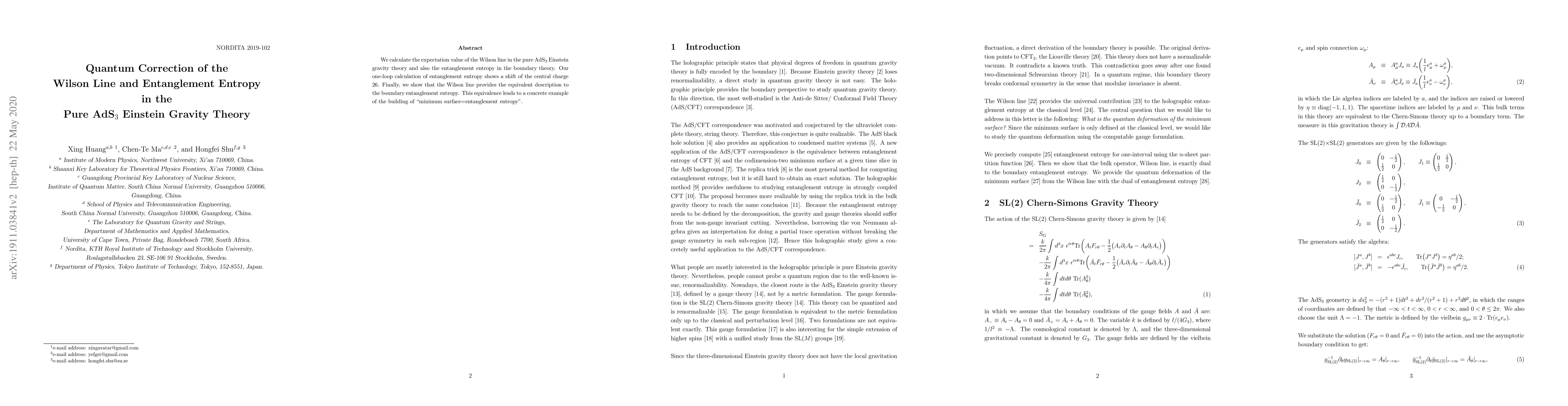 This paper calculates the expectation value of the Wilson line and the entanglement entropy in pure AdS$_3$ Einstein gravity, revealing a one-loop correction that shifts the central charge by 26. It demonstrates the equivalence between the Wilson line and boundary entanglement entropy, providing a clear example of "minimum surface=entanglement entropy."
