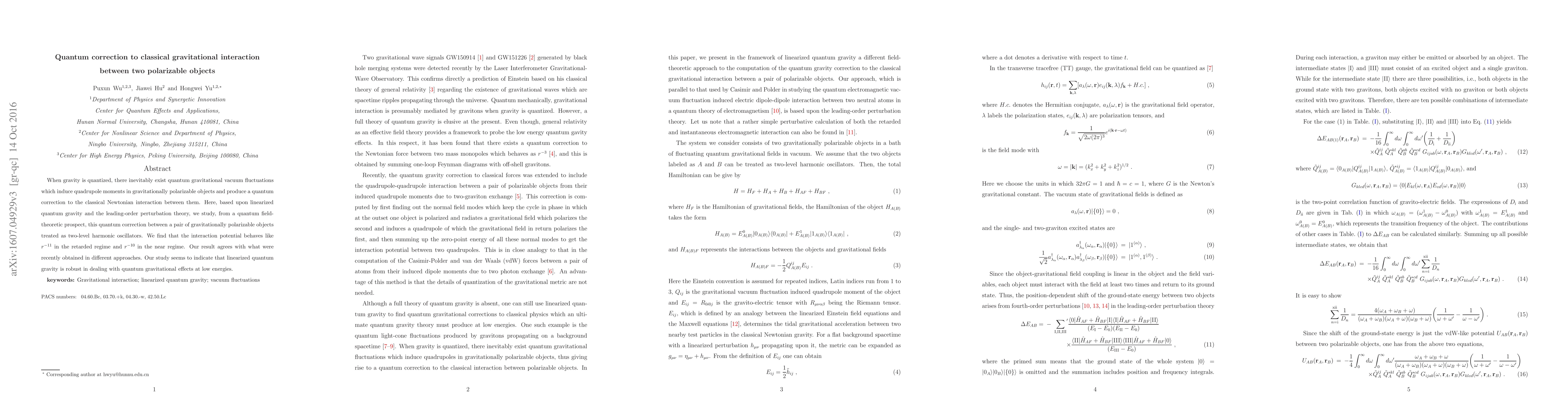 This paper quantizes gravitational interactions between polarizable objects, revealing a quantum correction to classical Newtonian forces due to vacuum fluctuations. The study finds that the interaction potential exhibits $r^{-11}$ behavior in the retarded regime and $r^{-10}$ in the near regime, confirming the robustness of linearized quantum gravity at low energies.