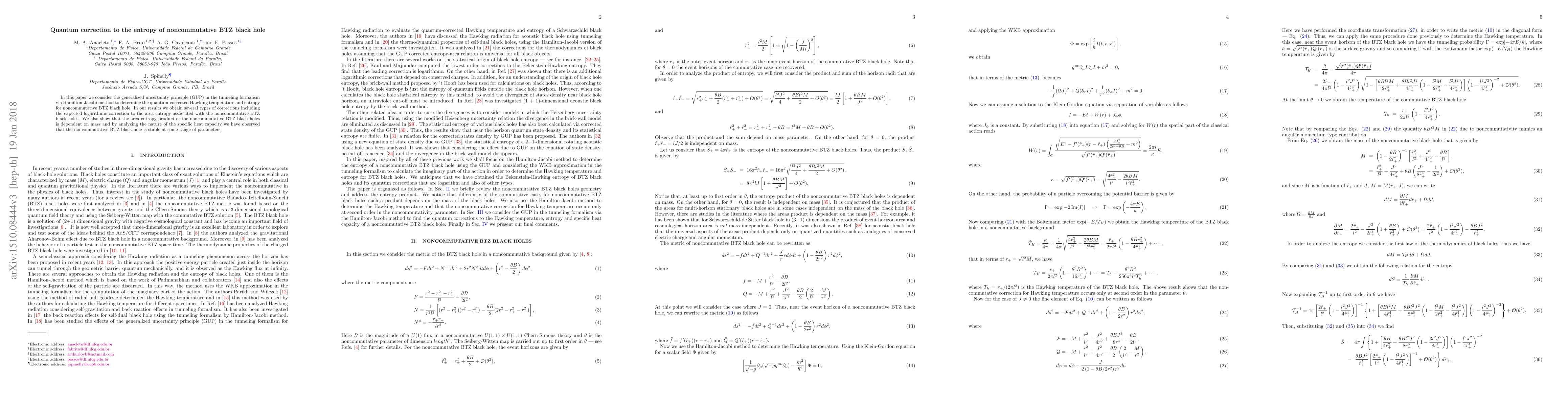 This paper uses the generalized uncertainty principle in the tunneling formalism to determine quantum-corrected Hawking temperature and entropy for noncommutative BTZ black holes, finding a logarithmic correction to area entropy and demonstrating stability over certain mass ranges.