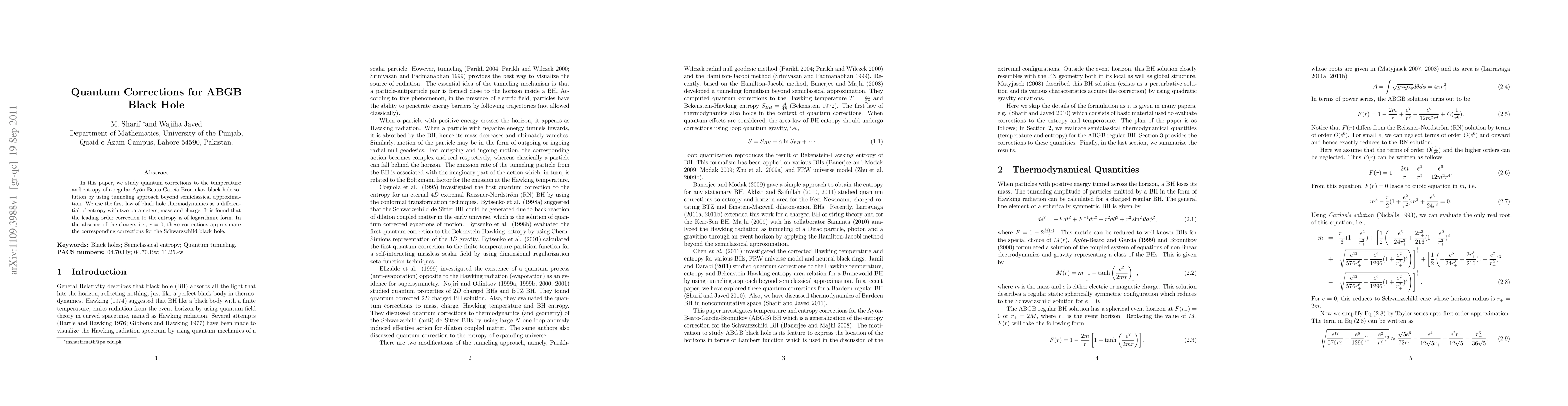 This paper investigates quantum corrections to the temperature and entropy of a regular ABGB black hole using a tunneling approach beyond semiclassical approximation. The leading order correction to the entropy is found to be logarithmic, with similar results to Schwarzschild black hole corrections when charge is absent.